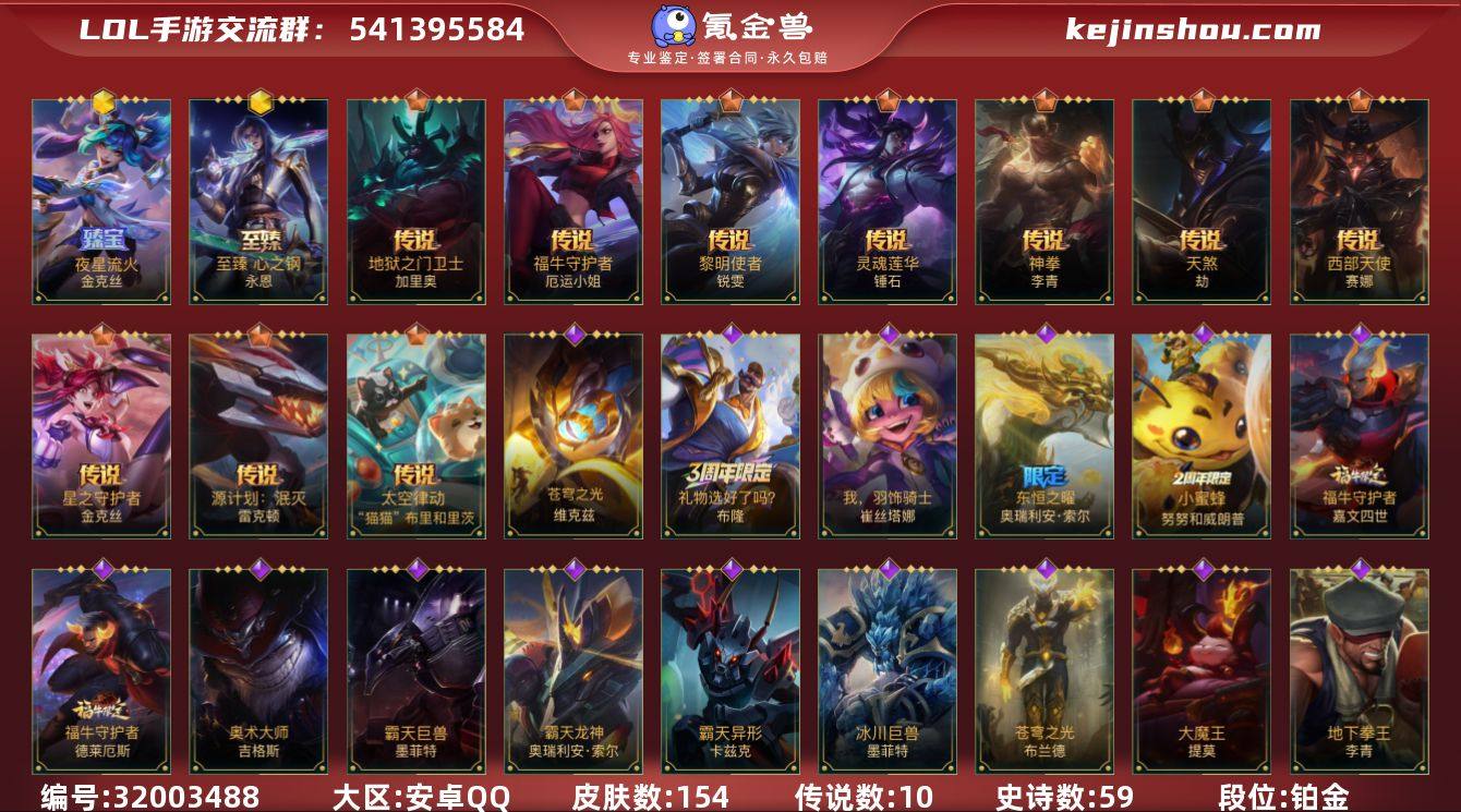 实名: 可修改 段位: 铂金 皮肤数: 154 神话皮: 至臻心之钢永恩,夜星流火 金克丝 传说皮: 地狱之门卫士,福牛守护者女枪,黎明使者锐雯,神拳盲僧,天煞劫,西部天使赛娜,星之守护者金克丝,灵魂莲华锤石,源计划:泯灭,太空律动机器人 亮点: 【优质装备】:福牛守护者女枪,黎明使者锐雯,神拳盲僧,天煞劫,西部天使赛娜,星之守护者金克丝,灵魂莲华锤石,源计划:泯灭,至臻心之钢永恩