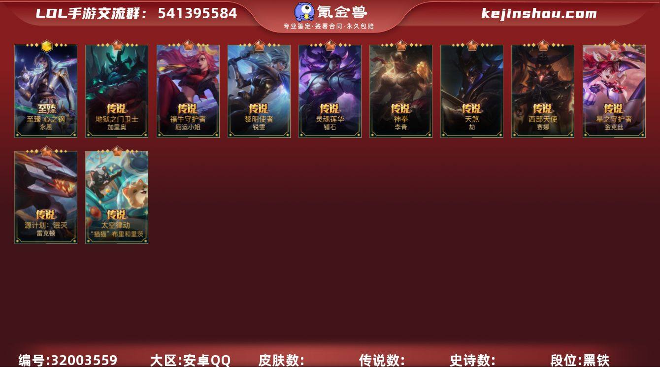[17303499]2神话 10传说 59史诗 154皮肤 可二次 可修改实名 【段位】铂金 【神话皮】夜星流火 金克丝,至臻心之钢永恩 【传说皮】地狱之门卫士,西部天使赛娜,天煞劫,神拳盲僧,星之守护者金克丝,黎明使者锐雯,福牛守护者女枪,太空律动机器人,源计划:泯灭,灵魂莲华锤石