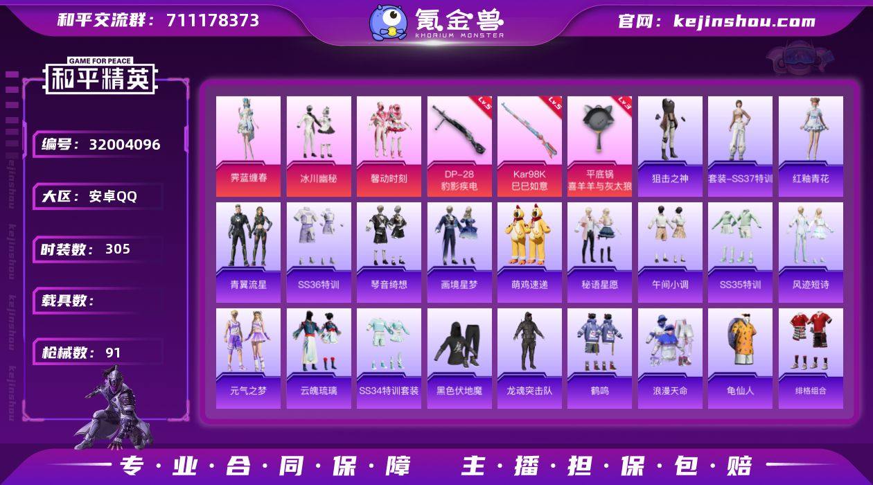 实名:可二次实名 是否支持人脸包赔:支持 粉装数量:3 特效枪数量:3 时装数:305 枪械数:91 霁蓝缠春,冰川幽秘,馨动时刻 五级DP-28-豹影疾电,五级Kar98K-巳巳如意,三级平底锅-喜羊羊与灰太狼 狙击之神,红釉青花,SS37特训,青翼流星,画境星梦,琴音绮想,SS36特训,萌鸡速递,风迹短诗,秘语星愿,SS35特训,午间小调,元气之梦,云魄琉璃,SS34特训套装,缤纷果语,白糯汤圆,白色伏地魔,春光漫游,长空猛禽,潮流炫酷,都市魅力,绯格组合,疯狂小兔子,粉团憨憨,龟仙人,鹤鸣,黑色伏地魔,黄色伏地魔,黄色运动,竞技达人朋克,竞技名士,极速红龙,街头潮人,空岛之星,快闪甜心,蓝彩潮人,龙魂突击队,恋恋初桃,琉璃情波,浪漫天命,莱茵河畔,恋语绒绒,冷焰舞者,猛禽,梦幻奶油,魅力单车,霓虹街区,柠萌假日,破蛋小黄鸡,青春校园,轻风白浪,青年教官,青涩时光,人气偶像,深蓝色名流,SS24特训,SS25特训,SS26特训,SS27特训,SS28特训,SS30特训套装,SS31特训套装,SS32特训套装,SS33特训套装,巳巳如意,特训学院,完美偶像,王牌教练,顽皮玉兔,无暇誓言,星夜迷魅,耀粉歌者,玉兔迎春,银月精灵,智谋强哥 炫彩糖果飞行器,炫彩糖果降落伞,冰川粉黛降落伞,春暖花开降落伞,江南烟雨降落伞,圣堂之誓降落伞