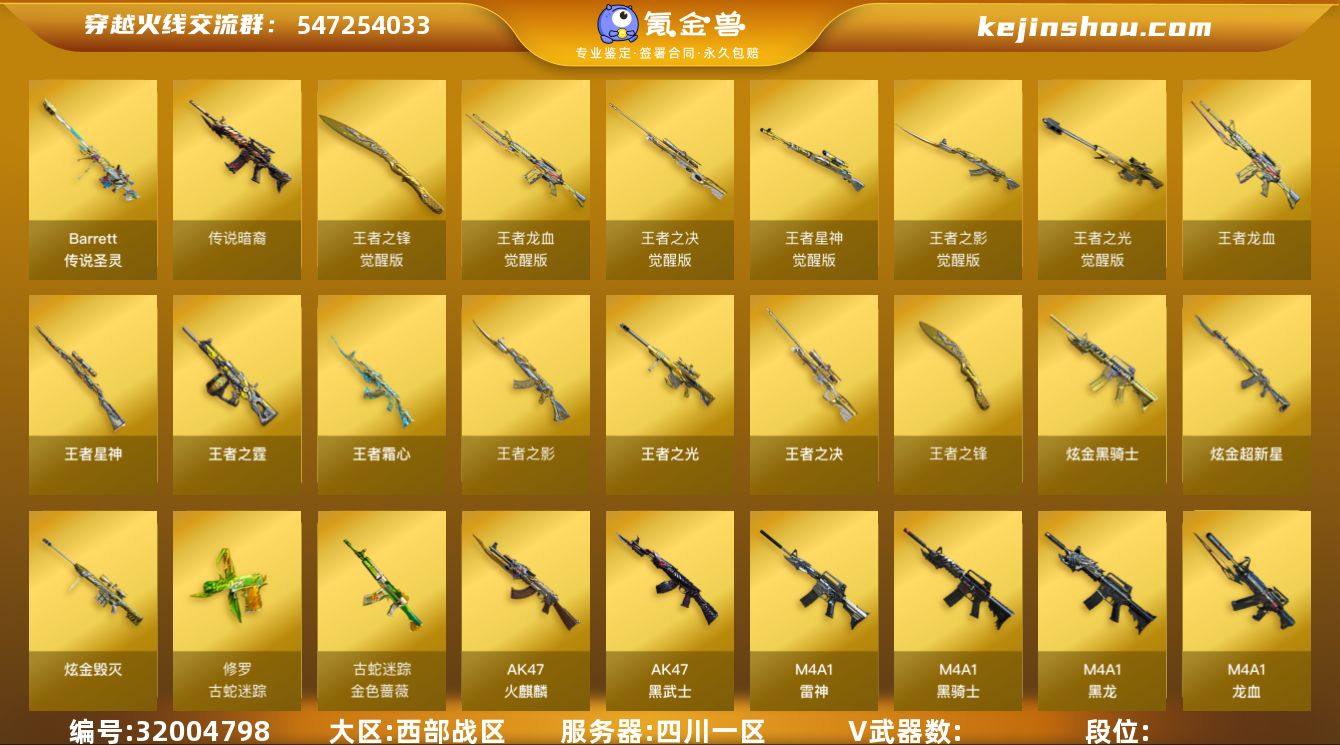L629522 【4防传说女帝/传说暗裔/传说圣灵/幻神(AGS24冠军+周瑜+黄忠)/竞技荣光套/王者星神/白虎(白鲨S23冠军)/毁灭(魔灵+枪娘格雷姐妹+张飞)/电玩白虎/古蛇蔷薇/火麒麟(关羽)/雷神(脉冲核心+赵云)/黑骑士(摸金校尉+战神马超)/机械迷城穹宇/王者龙血/王者霜心/5盘龙+3炼狱/5烈龙+斯太尔蝴蝶/柯尔特竞技荣光/炽芒蝶刃/4防王者葵惊若翩鸿/4防王者炫/】 会员等级6 英雄级武器数量67 【可二次实名】 【永久包赔】 【能人脸包赔】 【VIP 6】 【能排位】 【无】 稀有套装1 传说武器2 王者炫金武器11 热门武器5 英雄级武器27 稀有武器9 暴走生化3 挑战大师11 角色11 稀有皮肤23 音效卡1 投掷武器7 稀有套装:竞技荣光套; 传说武器:传说圣灵,传说暗裔; 王者炫金武器:王者龙血,王者霜心,王者之光,炫金超新星,炫金骑士,王者之决,王者星神,王者之霆,王者之锋,王者之影,炫金毁灭; 热门武器:炽芒蝶刃,M200-幻神,Scar Light-白虎,M200-竞技荣光,斯泰尔-蝴蝶; 英雄级武器:机械迷城-穹宇,死神-雪域霜狐,Barrett-暗月传说,沙鹰-天神,金色蔷薇-古蛇迷踪,修罗-古蛇迷踪,AK47-黑武士,无影-神兵利器,加特林-炼狱,9A-91-烈火,白虎-电玩蓝兔,AK47-B-常胜将军,汤姆逊-烈龙,M4A1-黑骑士,AK47-火麒麟,沙鹰-修罗,M4A1-雷神,柯尔特-竞技荣光,擎天-竞技荣光,屠龙,擎天,M4A1-黑龙,RPK-盘龙,麒麟刺,Barrett-毁灭,M4A1-龙血,唐刀-古蛇迷踪; 稀有武器:夺魂,迷你深渊冰龙,加利尔ACE-零号,HK417-朱雀-蛇隐宗,迷你波特博士,迷你裂空之翼,AWM-灵狐-15周年嘉年华,M37-葵,金色蔷薇-空; 暴走生化:女皇终结者-魔龙之吻,5盘龙,5烈龙; 挑战大师:激光毁灭者-超越,激光毁灭者,巨龙咆哮,VEPR-12-紫魔,冰龙粉碎者-白马银枪,神圣爆裂者,巨龙咆哮-深渊金,乱世-超越,乱世-超...