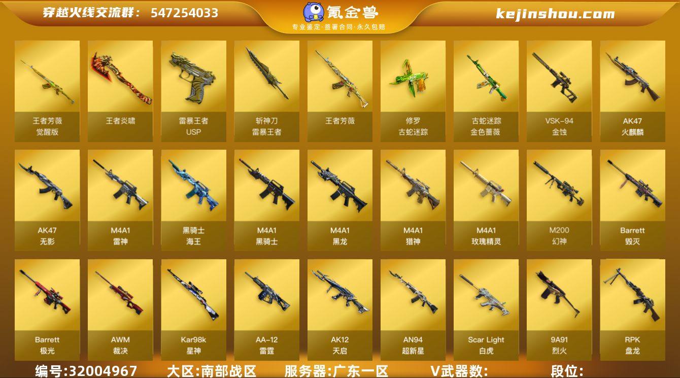 L629523 【传说圣谕/幻神(AGS17冠军+电流骇客)/裁决+音效卡(运输船+羽挚+星际旅行+百城联赛)/星神+音效卡(璀璨)/白虎*2+音效卡(白鲨s23冠军+暗星)/玄豹套/天戎/幻影/金蚀/毁灭(青帝+虹光风暴)/火麒麟(巅峰荣耀+心动糖果)/黑骑士(破浪10年)/雷神/AK天启/qbz天罚+音效卡/HK朱雀电竞+竟星音效卡/王者芳薇/3盘龙+2炼狱/6烈龙+异变清道夫+蝴蝶/USP冥王*2/USP雷暴王者/炽芒蝶刃(巅峰荣耀)/4防鹰/4防王者沙漠玫瑰/】 会员等级4 英雄级武器数量112 【可二次实名】 【永久包赔】 【能人脸包赔】 【VIP 4】 【能排位】 【枪王】 稀有套装1 传说武器1 王者炫金武器5 热门武器6 英雄级武器43 稀有武器12 暴走生化7 挑战大师13 角色7 稀有皮肤42 音效卡11 投掷武器13 稀有套装:玄豹套; 传说武器:传说圣谕; 王者炫金武器:斩神刀-雷暴王者,USP雷暴王者,王者冰锋,王者炎啸,王者芳薇; 热门武器:Scar Light-白虎,炽芒蝶刃,荣耀世冠-龙啸,M200-幻神,Kar98K-星神,斯泰尔-蝴蝶; 英雄级武器:RPK-盘龙,M4A1-雷神,M4A1-猎神,VSK-94-金蚀,QBZ03-天罚,HK417-朱雀-电竞之星,屠龙-电竞之星,擎天,丛林匕首-玄豹,Scar Light-玄豹,Anaconda-玄豹,M4A1-黑龙,USP-冥王,汤姆逊-烈龙,炼狱-百战金芒,M4A1-黑骑士,加特林-炼狱,机械迷城-穹宇,麒麟刺-百战金芒,FAMAS G2-天戎,沙鹰-天神,死神-雪域霜狐,9A-91-烈火,AK47-无影,Barrett-毁灭,黑骑士-海王,Barrett-暗月传说,AK-47-猩红传说,金色蔷薇-古蛇迷踪,屠龙,AWM-裁决,修罗-古蛇迷踪,G36C-幻影,龙啸,M4A1-玫瑰精灵,AK12-天启,AN94-超新星,沙鹰-修罗,麒麟刺,AA-12-雷霆,AK47-火麒麟,Barrett-极光,唐刀-古蛇迷踪; 稀有武器:迷你地狱终结者,真的是手枪,AWM-灵狐-15周年嘉年华,异变清道夫-蛇影双骄,加利尔ACE-零号,迷...