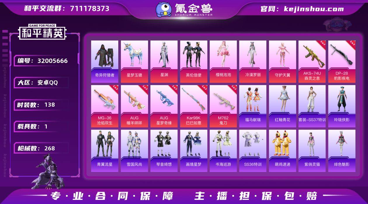 精品素材 巡查衣+无敌战神+M4星际漫游+都市苹果 手Q-6粉装-5特效枪-1载具-1粉色飞行器-83984热力值-22王牌印记-241套装-272枪皮LK262212 【热门品类】:绝对防御上衣,套装-浪漫天命,套装-都市猎人,套装-胖达圆圆,套装-金羽特工,套装-龟仙人,套装-暗影哥特,套装-浪漫波比,套装-粉红小猪,M416-星际漫游 【粉色套装】:粉装-智能音符,粉装-琉璃脉冲,粉装-王牌四分卫,粉装-骨龙祭渊,粉装-庄周梦蝶,角色-月影灵韵 【粉色枪皮等级】:M416-五爪金龙(七级),M416-电玩时刻(五级),Kar98K-巳巳如意(五级) 【粉色载具】:暮色幽蹄 【粉色枪皮】:M416-五爪金龙,M416-电玩时刻,Kar98K-巳巳如意,Mk14-福马献瑞 【粉色飞行器】:暮色之舞飞行器 【粉色降落伞】:阿狸红降落伞,星之彼岸降落伞,筑梦精灵降落伞,炫光之旅降落伞,圣堂之誓降落伞,精灵梦叶罗丽降落伞,金丰海韵降落伞,临安公主降落伞,暮色玫影降落伞 【稀有套装】:套装-龟仙人,套装-巳巳如意,套装-暖暖麦兜,套装-燕燕于飞,套装-鱼渊荷华,套装-粉恋花,套装-紫幽梦,套装-蓝冰羽,套装-星渊小夜曲,套装-雨过天青,套装-红釉青花 【稀有枪皮】:AKM-四圣焕新,AKM-夜灯,AKM-奇异狩猎者,AKM-彩虹符号,AKM-影袭,AKM-灼热熔岩,AKM-环太平洋,AKM-萌趣颜团子,AKM-虎虎生威,AKM-阿狸红,AKM-霓虹街区,AKM-龙的传人,M16A4-夜灯,M16A4-幻世战舞者,M16A4-快乐主宰,M16A4-星际漫游,M16A4-机械英豪,M16A4-甜心亚梦,SCAR-L-暗夜玫瑰,SCAR-L-炫彩节奏,SCAR-L-玉兔迎春,SCAR-L-红色方程式,SCAR-L-黄金龙骨,M416-夜灯,M416-快乐主宰,M416-星际漫游,M416-滑板小狐,M416-糯团青竹,M416-红色方程式,M416-蓝色火焰,M416-黄金狮王,M416-黄金龙骨,GROZA-异彩先驱,GROZA-彩虹符号,GROZA-影袭,GROZA-恐龙拽拽,GROZA-懵萌...