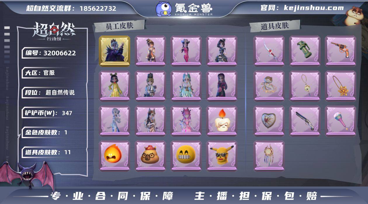 金皮1;紫皮10;道具皮11;皮肤:零-渡鸦公爵,小黄-异色序曲,爱丽丝-丝缕哀歌,莉莉-情公主,阿念-庆宴绮愿,爱丽丝-耀眼的你,爱丽丝-瑞羽衔春,小黄-呱呱雨衣,阿念-王子与骑士,薇薇安-白光莹,巫铃儿-素影瑶光;道具:转轮手枪-新星时代,闪光弹-金戈玄铜,刺刀-铂刺与红萼,音响-鸣沙鼓,摸金符-紫霄,专业手电-云端梦想计划,急救包-蔷薇物语,腰包-宝剑八,摸金符-花落精绝,长鞭-小狗蛇点点鞭,短管猎枪-星光的裁决;饰品:头饰-卑微头套,头饰-鱼头怪头套,头饰-火爆了头套,头饰-萨卡班甲鱼头套,头饰-滑稽头套,头饰-鳄霸天头套,头饰-大葱明头套,头饰-炙热烧烤,头饰-面具马头套,头饰-蒜了八,头饰-哈士奇头套,头饰-嘻嘻头套,头饰-小财神豚豚头套,头饰-小狗蛇点点头套,头饰-烈焰红唇头套,头饰-呆滞头套,头饰-驼半仙头套,头饰-烛光纪念,头饰-像素朋克墨镜,头饰-后室幸存者头套,挂饰-钗头凤,挂饰-九色祥鹿,挂饰-天使消失的年代,背饰-牛啤背包,背饰-云梦之星,背饰-毛球夹子;动作:动作-新年摇,动作-luvaboy,动作-舞台中心,动作-心跳摇,动作-sugar摇,动作-律动迪斯科,动作-抬手,动作-旋转舞,动作-举牌;工牌背景:工牌背景-珊瑚海,工牌背景-点点萌伴,工牌背景-冰晶宫,工牌背景-圣光之誓,工牌背景-雷霆轩,工牌背景-童话扉页,工牌背景-蓝海奇遇;工牌动作:工牌动作-元气剪刀手,工牌动作-轻躯鹤立,工牌动作-虔诚之姿;员工:临云,兰,逍遥,爱德华,零,小黄,艾伦,薇薇安,爱丽丝,小满,阿念,巫铃儿,莉莉;累充675元;铲铲币34.7万;金砖4;段位:超自然传说7;魔盒等级:1;