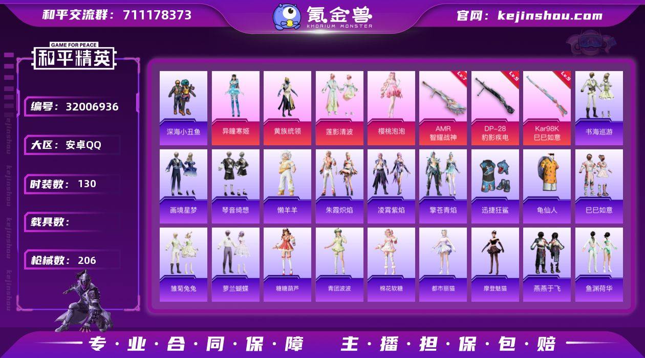 安卓 手Q-4粉装-5特效枪-0载具-2粉色飞行器-58413热力值-13王牌印记-130套装-206枪皮 【热门品类】:套装-深海小丑鱼,套装-龟仙人 【粉色套装】:粉装-黄族统领,粉装-莲影清波,角色-樱桃泡泡,角色-异瞳寒姬 【粉色枪皮等级】:UMP45-萌骑冒险(二级),Kar98K-巳巳如意(五级),Mk14-福马献瑞(五级),AMR-智耀战神(七级),DP-28-豹影疾电(五级) 【粉色枪皮】:UMP45-萌骑冒险,Kar98K-巳巳如意,Mk14-福马献瑞,AMR-智耀战神,DP-28-豹影疾电 【粉色飞行器】:炫彩糖果飞行器,黄族统领飞行器 【粉色降落伞】:绝对恒星降落伞,春暖花开降落伞,海渊国主降落伞,梦幻舞会降落伞,飒粉甜心降落伞,黄族统领降落伞,千金淑猫降落伞,月影灵韵降落伞,智耀战神降落伞,喜羊羊与灰太狼降落伞,异瞳寒姬降落伞,炫彩糖果降落伞,霁蓝缠春降落伞 【稀有套装】:套装-龟仙人,套装-巳巳如意,套装-雪国风尚,套装-炫彩糖果,套装-马上来财,套装-雏菊兔兔,套装-萝兰蝴蝶,套装-糖糖葫芦,套装-青团波波,套装-棉花软糖,角色-都市丽猫,角色-摩登魅猫,套装-燕燕于飞,套装-鱼渊荷华,套装-粉恋花,套装-紫幽梦,套装-蓝冰羽,套装-星影赞美诗,套装-极速光影,套装-彩虹兔,套装-云朵鹅,套装-雪绒豹,角色-绛羽幽主,角色-夜瞳黯灵,套装-朱霞炽焰,套装-凌霄紫焰,套装-擎苍青焰,玩偶服-懒羊羊,套装-书海巡游,套装-画境星梦,套装-琴音绮想,套装-雨过天青,套装-红釉青花,角色-霜纹水星 【稀有枪皮】:AUG-冰晶雪宝,AKM-彩虹符号,AKM-破晓战魂,AKM-缤纷海域,AKM-龙的传人,M16A4-幻世战舞者,M16A4-红色方程式,M16A4-蓝色火焰,SCAR-L-夜灯,SCAR-L-炫彩节奏,SCAR-L-玉兔迎春,SCAR-L-红色方程式,M416-糯团青竹,M416-红色方程式,M416-蓝色火焰,GROZA-懵萌河马,AUG-天降萌叽,AUG-耀粉歌者,QBZ-彩虹...