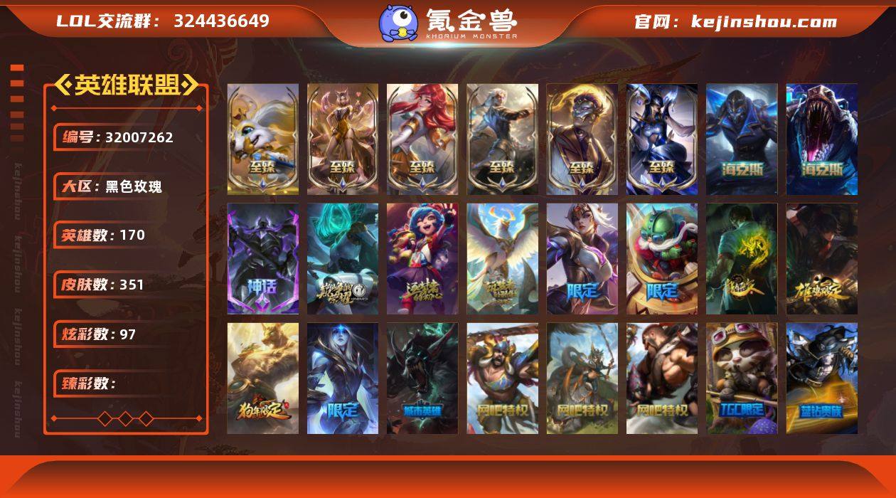 实名: 可修改 英雄数: 170 皮肤数: 351 炫彩数: 97 至臻: 至臻 K/DA 阿狸,至臻 绒毛菲兹,至臻 战斗学院 拉克丝,至臻 黑夜使者 凯隐,至臻 焰执事 布兰德,至臻 青花瓷 丽桑卓 海克斯: 海克斯 雷克顿,海克斯 卡萨丁 赛季限定皮: 胜利枪神 卢锡安,胜利凤凰 艾尼维亚,胜利之王 泰达米尔,胜利剑圣 易,胜利之运 崔斯特,胜利女神-菲奥娜 冠军限定系列: S1FNC 酒桶,S1FNC 库奇,S2 暗杀星 发条,S3 SKT T1 李青,S4 SSW 图奇,S5 SKT T1 阿利斯塔,S5 SKT T1 阿兹尔,S5 SKT T1 滑板鞋,S11 EDG 厄斐琉斯,S13 T1 李青 冰雪节限定: 胡桃夹子 萨科,魄罗骑士 瑟庄妮,圣诞开心鬼 提莫,圣诞狂欢 基兰,圣诞老人 布隆,圣诞老人 古拉加斯,圣诞驯鹿 克格莫,邪恶圣诞老人 维迦,幸福女神 乐芙兰 泳池派对: 泳池派对 普朗克 万圣节限定: 鬼影重重 魔腾,海贼 瑞兹,魅惑女巫 奈德丽 年限: 北辰之威 内瑟斯,虎痴之拳 蔚,龙的传人 李青 周年: 10周年 安妮,10周年 凤凰 其他限定/神话皮: 源代码 乐芙兰,防暴天使 凯尔,暗影 沃里克,都铎王朝 图奇,防暴士兵 格雷福斯,钢铁之翼 艾尼维亚,蓝色忧郁 崔斯特,密林猎手 提莫,野兽猎人 德莱文,野兽猎人 瑟庄妮,野兽猎人 泰达米尔,御星魔矢 艾希,灰烬骑士 莫德凯撒,外星装甲 库奇 亮点: 【优质装备】:至臻 K/DA 阿狸,至臻 绒毛菲兹,至臻 战斗学院 拉克丝,至臻 黑夜使者 凯隐,至臻 焰执事 布兰德,源代码 乐芙兰,防暴天使 凯尔,暗影 沃里克,都铎王朝 图奇,防暴士兵 格雷福斯,钢铁之翼 艾尼维亚,蓝色忧郁 崔斯特,密林猎手 提莫,野兽猎人 德莱文,野兽猎人 瑟庄妮,野兽猎人 泰达米尔,御星魔矢 艾希,灰烬骑士 莫德凯撒,至臻 青花瓷 丽桑卓,无畏骑士 瑟庄妮 赤子初心,外星装甲 库奇,净雪之月 莫甘娜 冬虹,魔女 阿卡丽 虚荣