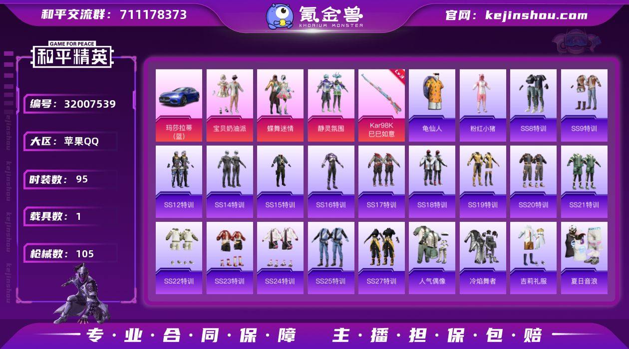 苹果 手Q-3粉装-1特效枪-1载具-0粉色飞行器-31072热力值-5王牌印记-95套装-105枪皮 【热门品类】:套装-龟仙人,套装-粉红小猪 【粉色套装】:粉装-宝贝奶油派,粉装-蝶舞迷情,粉装-静灵氛围 【粉色枪皮等级】:Kar98K-巳巳如意(三级) 【粉色载具】:玛莎拉蒂Ghibli(蓝) 【粉色枪皮】:Kar98K-巳巳如意 【粉色降落伞】:快乐主宰降落伞,心之恋语降落伞 【稀有套装】:套装-龟仙人 【稀有枪皮】:AKM-夜灯,AKM-彩虹符号,AKM-生命誓言,AKM-破晓战魂,AKM-虎虎生威,AKM-霓虹街区,M16A4-幻世战舞者,M16A4-快乐主宰,M16A4-红色方程式,M16A4-蓝色火焰,SCAR-L-玉兔迎春,SCAR-L-甜蜜誓约,SCAR-L-红色方程式,M416-快乐主宰,M416-红色方程式,M416-绯红前夜,M416-蓝色火焰,GROZA-异彩先驱,AUG-天降萌叽,AUG-耀粉歌者,AUG-魔法学院,QBZ-飞驰魅影,M762-天降萌叽,M762-深海曼妙,M762-牛气冲天,M762-瑞龙福将,M762-绯红前夜,Mk47-妙红点点,G36C-金风玉露,AC-VAL-天降萌叽,UZI-众神之王,UZI-天降萌叽,UZI-炫彩节奏,UZI-红色方程式,UZI-金风玉露,UMP45-快乐主宰,UMP45-蓝色火焰,Vector-彩虹符号,汤姆逊-异彩先驱,汤姆逊-耀粉歌者,MP5K-众神之王,MP5K-异彩先驱,P90-飞驰魅影,Kar98K-彩虹符号,Kar98K-炫彩节奏,Kar98K-红色方程式,Kar98K-飞驰魅影,SKS-夜灯,SKS-炫彩节奏,Mini14-异彩先驱,Mini14-炫彩节奏,Mini14-穿刺龙虾,Mini14-耀粉歌者,Win94-瑞龙福将,SLR-众神之王,SLR-彩虹符号,AMR-妙红点点,S686-彩虹符号,S686-深海曼妙,S686-生命誓言,S686-红色方程式,S1897-碧影闪光,S1897-飞驰魅影,S12K-瑞龙福将,S12K-破晓战魂,S12K-幻世战舞者,M249-妙红点点,M249-破晓战魂,M249-糯团青竹,DP-28-彩虹符号,MG3-妙红点点,MG3-幻世战舞者,MG3-瑞龙福将 【其他套...