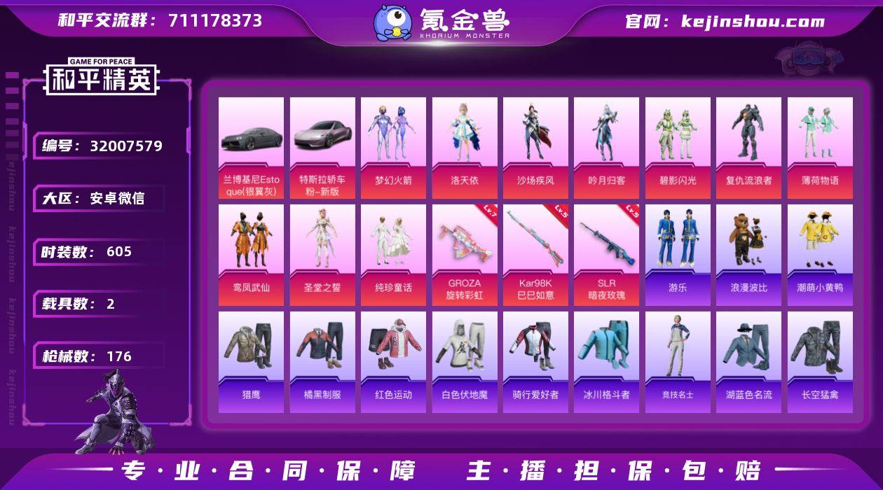 实名: 可修改 时装数: 605 载具数: 2 枪械数: 176 战备数: 2 热门装扮: 梦幻火箭(新101),浪漫波比,沙场疾风,吟月归客,洛天依,碧影闪光,薄荷物语,复仇流浪者,鸾凤武仙,潮萌小黄鸭,纯珍童话,圣堂之誓 载具: 特斯拉Roadster(沁心粉),兰博基尼Estoque(银翼灰) 稀有枪皮: SLR暗夜玫瑰,GROZA旋转彩虹,Kar98K-巳巳如意 亮点: 【优质装备】:七级GROZA-旋转彩虹