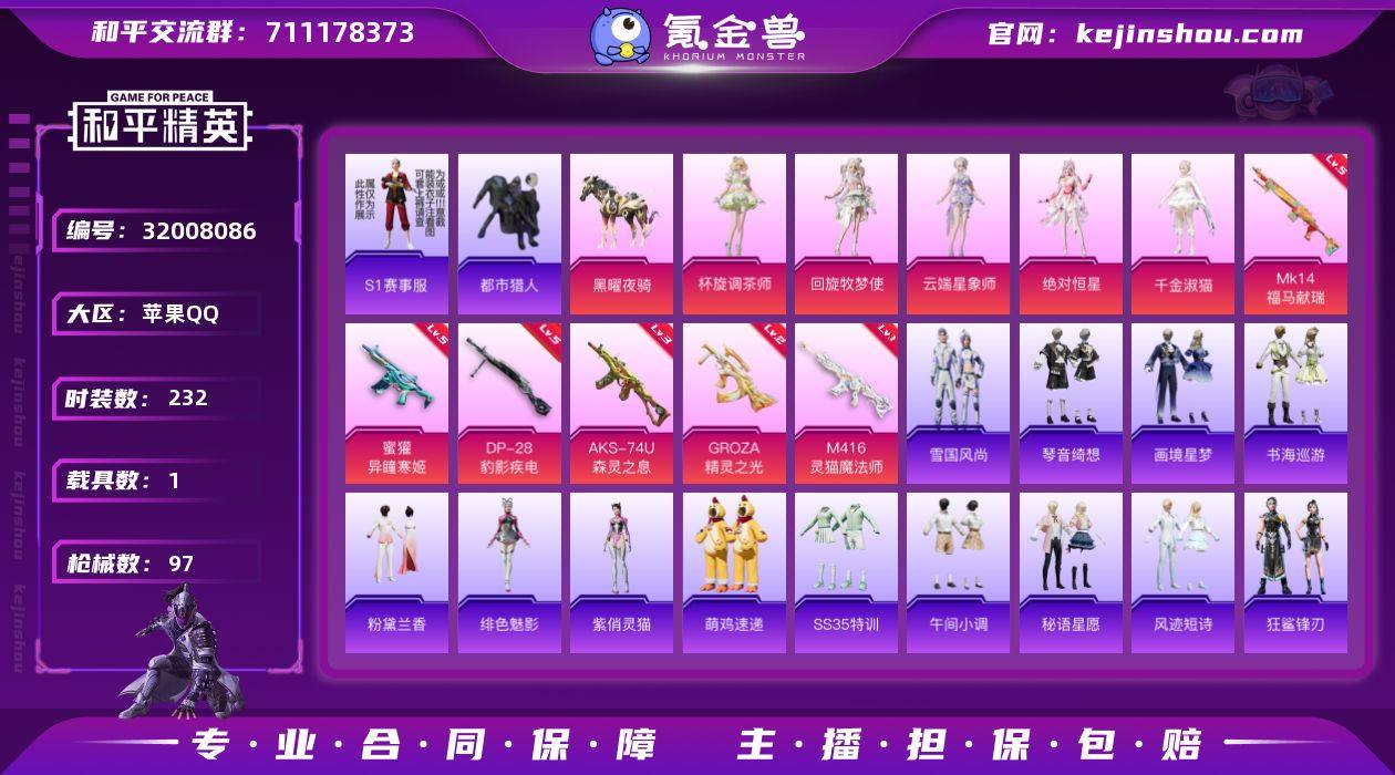 实名: 可修改 时装数: 232 载具数: 1 枪械数: 97 战备数: 1 热门装扮: 鹰眼刺客,好奇恐龙,都市猎人,S1赛事上衣,千金淑猫,绝对恒星,回旋牧梦使,杯旋调茶师,云端星象师 载具: 黑曜夜骑 稀有枪皮: GROZA-精灵之光,M416-灵猫魔法师,DP-28-豹影疾电,蜜獾-异瞳寒姬,AKS-74U-森灵之息,MK14-福马献瑞 亮点: 【优质装备】:都市猎人