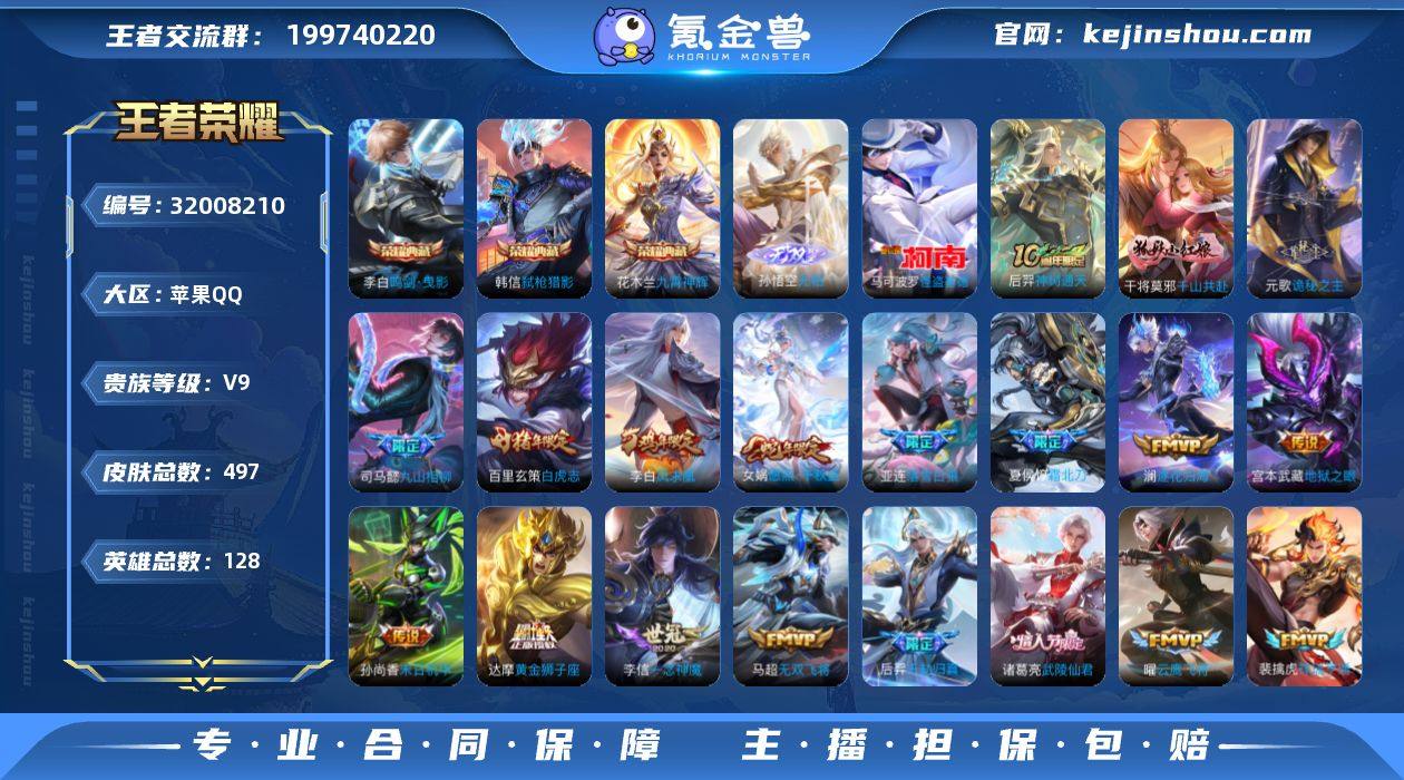 实名: 可修改 贵族等级: V10 英雄数: 128 皮肤数: 521 荣耀水晶: 武则天,天鹅之梦,倪克斯神谕,无限飓风号,杀手不太冷,鸣剑·曳影,星域神启,拾光映像 无双皮: 真我赫兹(瑶),青丘·九尾,小乔时之魔女 传说皮: 黄金狮子座,黄金射手座,冠军飞将,云鹰飞将,绛天战甲,黄金白羊座,猫影幻舞,久胜战神,炽阳神光,一念神魔,云霓雀翎,末日机甲-孙尚香,地狱火,仲夏夜之梦,音你心动-小乔,零号·赤焰,海洋之心,地狱之眼,飞鸢探春,音你心动-周瑜,胖达荣荣,李逍遥,乞巧织情,时之恋人-刘备,游龙清影,淬星耀世,超时空战士-狄仁杰,遇见胡旋,末日机甲-孙策,花朝如约,挚爱之约,挚爱花嫁,无双飞将,燃星之曲,画中仙,浮生妄,百相守梦(张飞),追逃游戏(亚瑟),追逃游戏(安琪拉),电玩·雷克斯,妄想实况,妄想奇谈,鲁班七号-时之奇旅,永恒水手月亮,夜礼服假面,小动物乐团,澜逐花归海,艾琳觅芳踪,琥珀纪元马超,乘龙·问璇玑,乘龙·铭钟鼎,乘龙·淬吴钩,貂蝉曦玄引,吕布曦玄引,落雪白狼,金乌负日,启明星使 限定皮: 冰锋战神,遇见飞天,李小龙,奔雷神使,祈雪灵祝,游园惊梦,梁祝,御风骁将,云端筑梦师,时雨天司,龙胆,白鹤梁神女,武圣,烈魂,魔法小厨娘,辉光之辰,异界灵契-孙尚香,玄嵩,白晶晶,岱宗,天狼溯光者,虎魄,天魔缭乱,神威,蜜橘之夏,永曜之星,幽恒,时之彼端,奇迹圣诞,飞衡,乒乒小将,太华,天狼征服者,青春决赛季,天狼狩猎者,冰霜恋舞曲,天狼运算者,逐梦之星,逐梦之影,热情桑巴,逐梦之光,神奇女侠,天狼绘梦者,凤求凰,寅虎·御盾,白虎志,青龙志,瑞麟志,玄武志,朱雀志,凤凰于飞,如梦令-嫦娥,纯白花嫁,至尊宝,默契交锋-兰陵王,真爱至上,一生所爱,武陵仙君,如梦令-后羿,大圣娶亲,默契交锋-花木兰,寅虎·瑞焰,霸王别姬-项羽,霸王别姬-虞姬,高山流水,孙行者,猪悟能,匿光追影者,女儿国国王,傲雪梅枪,寅虎·赤拳,寅虎·心曲,寅虎·展翼,时之祈愿-云中君,时之祈愿-瑶,补天,...