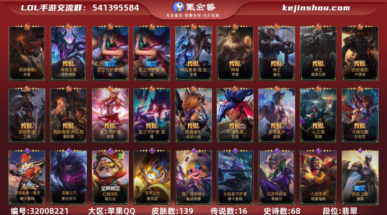 实名: 可修改 段位: 翡翠 皮肤数: 139 限定皮肤: 星之守护者霞,星之守护者洛 传说皮: 神拳盲僧,神王盖伦,神王诺手,西部魔影卢锡安,西部天使寒冰,星之守护者阿狸,星之守护者 落,跳跳倩影女枪,斗魂无双亚索,灵魂莲华腕豪,心之钢凯隐,西部魔影大小姐蕾欧娜,斗魂觉醒 莎弥拉,神龙尊者 圣龙 李青,海魔至尊 亚托克斯,西部魔影 永恩 亮点: 【优质装备】:神拳盲僧,神王盖伦,神王诺手,西部魔影卢锡安,西部天使寒冰,星之守护者阿狸,星之守护者 落,跳跳倩影女枪,灵魂莲华腕豪,心之钢凯隐,斗魂觉醒 莎弥拉