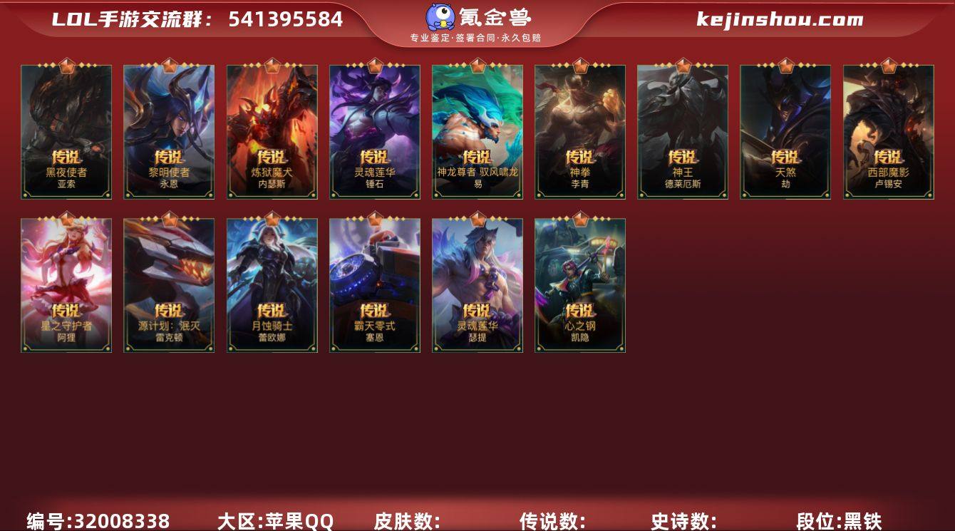 [17307367]2神话 1限定 18传说 45史诗 136皮肤 可二次 可修改实名 【段位】铂金 【神话皮】夜星流火 金克丝,天命豪侠 瑟提 【限定皮肤】闭月之颜貂蝉 【传说皮】心之钢凯隐,海魔至尊 亚托克斯,西部魔影 永恩,源计划:超体,灵魂莲华腕豪,西部魔影卢锡安,天煞劫,神王诺手,神拳盲僧,神龙尊者 驭风啸龙,炼狱魔犬,黑夜使者亚索,星之守护者阿狸,霸天零式塞恩,源计划:泯灭,黎明使者永恩,灵魂莲华锤石,月蚀骑士蕾欧娜