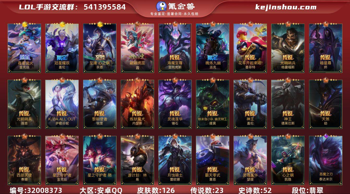 实名: 可修改 段位: 翡翠 皮肤数: 126 神话皮: 冠星耀辰盖伦,至臻心之钢永恩,夜星流火 金克丝 传说皮: 暗星尊,光明哨兵薇恩,K/DA ALLOUT萨勒芬妮,黎明使者锐雯,炼狱魔犬,欧米伽小队 幽灵特工,神王盖伦,神王诺手,天煞劫,西部天使赛娜,星之守护者金克丝,星之守护者 陨,月蚀骑士蕾欧娜,灵魂莲华锤石,源计划:林,光明哨兵格雷福斯,霸天零式塞恩,灵魂莲华腕豪,心之钢凯隐,花车开起来咯 墨菲特,魄炼九幽 派克,海魔至尊 亚托克斯,翩翩绣蕊 霞 亮点: 【优质装备】:暗星尊,光明哨兵薇恩,K/DA ALLOUT萨勒芬妮,黎明使者锐雯,炼狱魔犬,欧米伽小队 幽灵特工,神王盖伦,神王诺手,天煞劫,西部天使赛娜,星之守护者金克丝,星之守护者 陨,月蚀骑士蕾欧娜,灵魂莲华锤石,源计划:林,冠星耀辰盖伦,光明哨兵格雷福斯,霸天零式塞恩,灵魂莲华腕豪,心之钢凯隐,至臻心之钢永恩