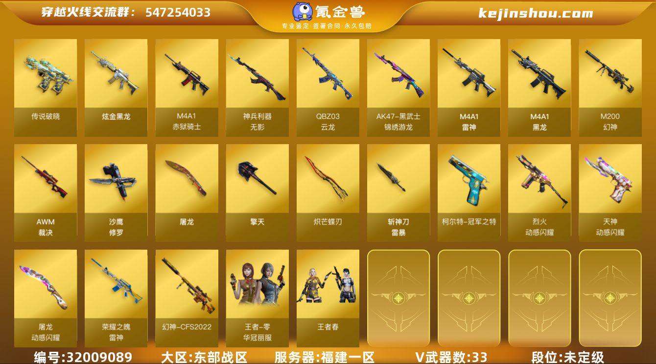 福建一区-33V-6王者-1炫金 【传说武器】:传说破晓 【热门武器】:传说破晓,M200-幻神,柯尔特-冠军之特,COP-白鲨,沙鹰-修罗,炽芒蝶刃,炽芒蝶刃-冠军炽芒皮肤 【王者炫金武器】:炫金黑龙 【皮肤】:幻神-宠儿-2021MVP,幻神-CFS2022,幻神-星火小队签名臻藏版 皮肤,白虎-AG-CFPLS20冠军,雷神-荣耀之魄,雷神-宇航兔皮肤,雷神-CFS十周年纪念版 皮肤,屠龙-星火燎原,麒麟刺-甜蜜糖果 皮肤,炽芒蝶刃-冠军炽芒皮肤 【角色】:王者零-华冠丽服,王者春,乔伊教练,暗夜-X,北极狐-X,飞虎队-X,嘉年华灵狐,灵狐者-X,曼陀罗-X,潘多拉-X,斯沃特-X,游珑儿 【人偶武器】:COP-白鲨,AWM-灵狐-15周年嘉年华,迷你波特博士,夺魂,深渊终结者手雷 【暴走生化】:超级对讲机 【挑战大师】:冰龙粉碎者-白马银枪,激光毁灭者III-白马银枪,神圣爆裂者-末日III 【英雄级武器】:M4A1-黑龙,M4A1-雷神,无影-神兵利器,QBZ03-云龙,黑武士-锦绣游龙,烈火-动感闪耀,AWM-裁决,M200-幻神,沙鹰-修罗,柯尔特-冠军之特,天神-动感闪耀,屠龙,擎天,炽芒蝶刃,屠龙-动感闪耀,斩神刀-雷暴,高爆手雷-雷霆,高爆手雷-雷暴,高爆手雷-幻灵*2,手雷-动感闪耀,高爆手雷-云龙,闪光弹-雷霆,闪光弹-雷暴,闪光弹-幻灵*2,闪光弹-雷霆王者-觉醒版*2,烟雾弹-雷霆,烟雾弹-雷暴,烟雾弹-幻灵*2,烟雾弹-云龙,烟雾弹-雷霆王者-觉醒版,M4A1-赤狱骑士 【道具】:AG战队炫彩背包,CFS限定背包,EP战队炫彩背包,全能枪王背包,女皇终结者-魔龙之吻,救世主-黑桃战神,绿色巨人,灵魂忍者,变异宝贝,迷雾幽灵,夺命之镰,防化服*2,金色流光-枪王排位*2,星辰流光-枪王排位,枪王排位28赛季金色流光,枪王排位29赛季金色流光,斯沃特表情,动感闪耀表情,EP战队名片,EP战队喷图,防弹头盔*2,防弹衣*2,C4工具钳*2,手雷...