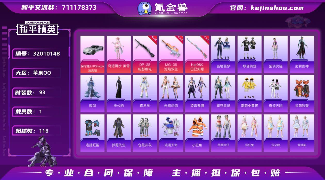 苹果 手Q-1粉装-6特效枪-1载具-0粉色飞行器-33179热力值-3王牌印记-93套装-116枪皮 【热门品类】:套装-浪漫天命,套装-小丑鱼,套装-潮萌小黄鸭 【粉色套装】:角色-奇迹舞步 美雪 【粉色枪皮等级】:UMP45-萌骑冒险(四级),AKS-74U-森灵之息(五级),Kar98K-巳巳如意(五级),Mk14-福马献瑞(三级),DP-28-豹影疾电(五级),MG-36-沧焰双生(五级) 【粉色载具】:保时捷918 Spyder(液态银) 【粉色枪皮】:UMP45-萌骑冒险,AKS-74U-森灵之息,Kar98K-巳巳如意,Mk14-福马献瑞,DP-28-豹影疾电,MG-36-沧焰双生 【粉色降落伞】:春暖花开降落伞,魔童闹海 敖丙降落伞 【稀有套装】:套装-荒原牛仔,套装-雪国风尚,套装-彩虹兔,套装-云朵鹅,套装-雪绒豹,角色-玫纹锢梦,套装-朱霞炽焰,套装-凌霄紫焰,套装-擎苍青焰,玩偶服-喜羊羊,角色-敖闰,角色-申公豹,角色-紫俏灵猫,角色-玄霖雨神,套装-画境星梦,套装-琴音绮想,套装-红釉青花 【稀有枪皮】:AKM-破晓战魂,AKM-缤纷海域,AKM-霓虹街区,M16A4-生命誓言,SCAR-L-炫彩节奏,M416-仓鼠灰灰,GROZA-黑色刀锋,AUG-耀粉歌者,QBZ-彩虹符号,M762-拳皇97,M762-云朵鹅,AC-VAL-天降萌叽,ACE32-画境星梦,ARX-凌霄紫焰,UZI-啾咪啾咪,UZI-红色方程式,UMP45-荒野猎神,Vector-彩虹符号,Vector-黑色刀锋,汤姆逊-耀粉歌者,MP5K-画境星梦,JS9-凌霄紫焰,P90-巳巳如意,Kar98K-彩虹符号,Kar98K-红色方程式,M24-冰封烈焰,SKS-夜灯,SKS-炫彩节奏,SKS-迅猛狂鲨,VSS-黑色刀锋,Mini14-春暖花开,Mini14-穿刺龙虾,SVD-云朵鹅,M1加兰德-画境星梦,S686-冰封烈焰,S12K-夜灯,AA12-G-画境星梦,SPAS-12-云朵鹅,M249-拳皇97,M249-糯团青竹,M249-绯穹魔姬,MG3-幻世战舞者,MG-36-凌霄紫焰,P92-拳皇97,P92-凌霄紫焰,P1911-冰封烈焰,沙漠之鹰-云朵鹅...