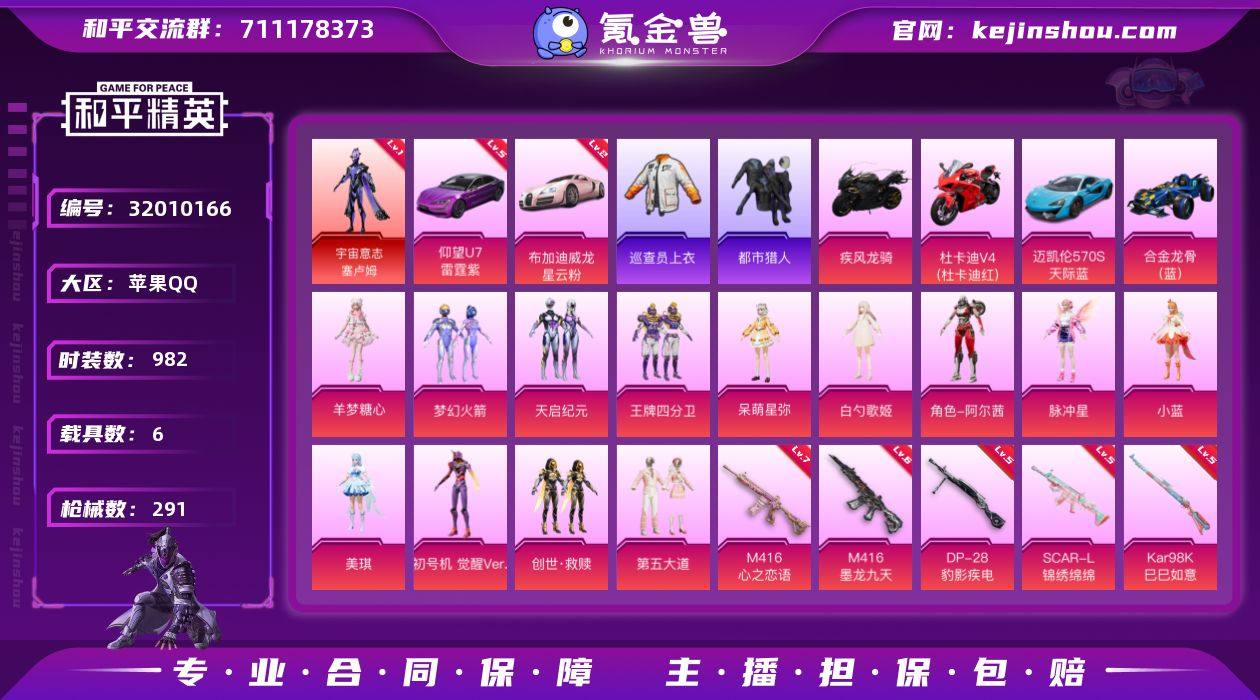 实名: 可修改 时装数: 982 载具数: 6 枪械数: 291 战备数: 6 神级装扮: 宇宙意志-塞卢姆 热门装扮: 梦幻火箭(新101),天启纪元,梦魇先生,万圣娃娃,鹰眼刺客,爱崽白熊,都市猎人,王牌四分卫,巡查员衣服,大橘为重,第五大道,白勺歌姬,呆萌星弥,阿尔茜,美琪,小蓝,脉冲星,创世·救赎,初号机 觉醒Ver.,羊梦糖心 载具: 合金龙骨(蓝),迈凯伦570S(天际蓝),杜卡迪 Panigale V4(杜卡迪红),布加迪威龙(星云粉),仰望U7(雷霆紫),疾风龙骑 稀有枪皮: M416心之恋语,SCAR-L-锦绣绵绵,M416墨龙九天,M200梦海之灵,UMP45-宇宙意志,Kar98K-巳巳如意,DP-28-豹影疾电 亮点: 【优质装备】:宇宙意志-塞卢姆,一级宇宙意志-塞卢姆(1级塞卢姆),五级仰望U7先锋版(雷霆紫),二级布加迪威龙(星云粉),巡查员衣服(绝对防御上衣),初号机 觉醒Ver.(新紫螳螂),8号机(新粉螳螂),Mark.06(新蓝螳螂),巡查衣(绝对防御上衣),暗影哥特(红眼罩),都市猎人,七级M416-心之恋语