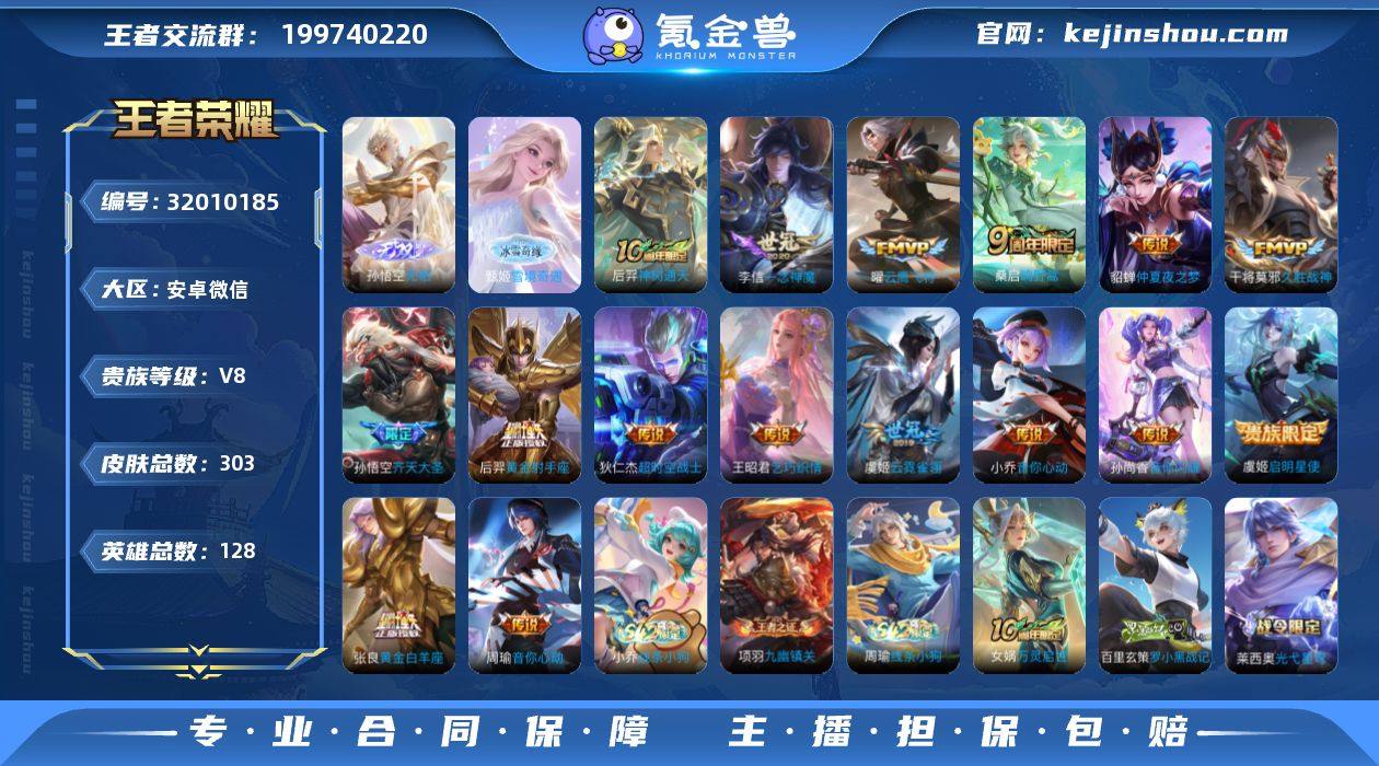 实名: 可修改 性别: 男号 贵族等级: V8 英雄数: 128 皮肤数: 303 无双皮: 雪境奇遇-甄姬,无相 传说皮: 黄金射手座,云鹰飞将,黄金白羊座,久胜战神,一念神魔,云霓雀翎,仲夏夜之梦,音你心动-小乔,音你心动-周瑜,乞巧织情,超时空战士-狄仁杰,音你闪耀,神树通天 限定皮: 岱宗,神威,至尊宝,高山流水,孙行者,五谷丰年,山海·玄木吟,山海·碧波行,齐天大圣,鸣野蒿 亮点: 【优质装备】:雪境奇遇-甄姬,黄金射手座,云鹰飞将(小将军),黄金白羊座,久胜战神,一念神魔,云霓雀翎,仲夏夜之梦(大飞蛾),音你心动-小乔,音你心动-周瑜,乞巧织情,超时空战士-狄仁杰,音你闪耀(rap皮),涂山容容