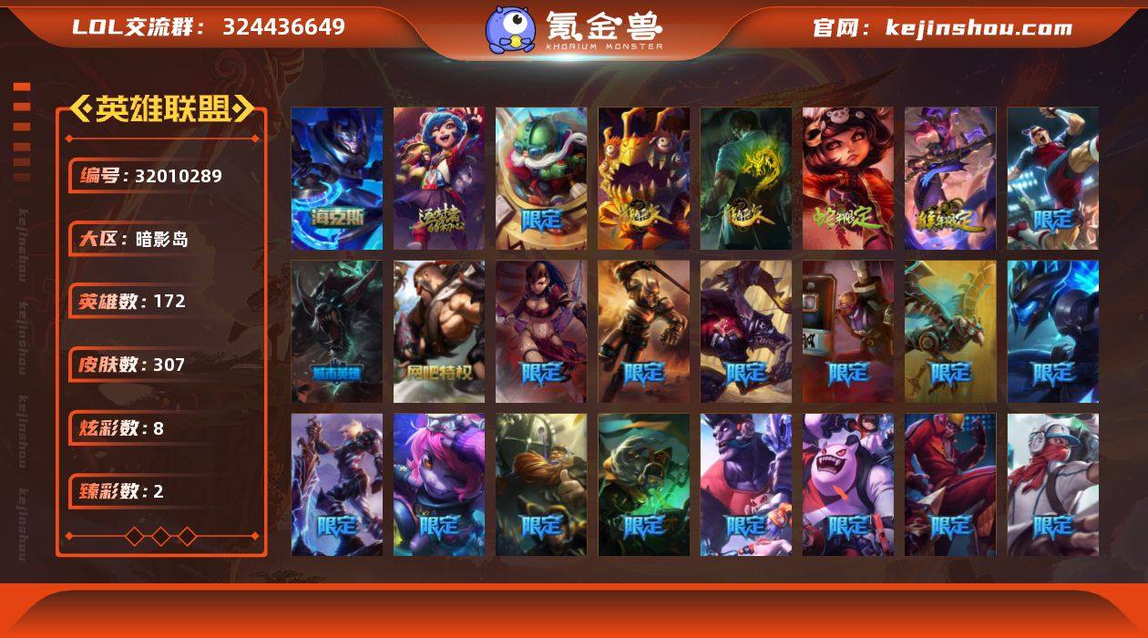 【LOLYH1564】172英雄/307皮肤/3神话/43限定/2臻彩/8炫彩/29传说/90史诗/未定级/10周年 安妮/10周年庆典 凤凰/海克斯 嘉文四世/飞龙在天/神龙尊者 圣龙李青 龙腾云起/龙的传人 李青/醒狮 克格莫/“你看见过我的熊猫吗?” 安妮/碧玉之牙 卡西奥佩娅/玉净夜叉 凯特琳/觅心游侠卢锡安/幸福女神 乐芙兰/圣诞精灵 崔丝塔娜/圣诞糖果棒 厄运小姐/“主人不要我了” 阿木木/胡桃夹子 小丑/平安夜女神 娑娜/英勇玩具兵船长/冰雪节 茂凯/雪默丁格/雪装 奈德丽/圣诞玩偶 波比/冰雪节 马尔扎哈/粉色萝莉 崔丝塔娜/冠军之刃 锐雯/冠军之矛 卡莉丝塔/S1FNC 酒桶/S1FNC 卡尔萨斯/S2 暗杀星 蒙多/S2 暗杀星 努努/S3 SKT T1 李青/S4 SSW 炼金/S5 SKT T1 阿利斯塔/S6 SKT T1 球女/南瓜头 费德提克/无头骑士 赫卡里姆/魅惑女巫 崔丝塔娜/泳池派对 李青/女猎手 希维尔/外星装甲 库奇/暗影 沃里克/野兽猎人 德莱文/勇者阿狸/都铎王朝 图奇/钢铁之翼 艾尼维亚/制胜金靴 李青/防暴士兵 辛吉德/警用试作体K-9 内瑟斯/铁哥们儿 奥拉夫/地狱之门卫士 加里奥/魔幻卡牌 崔斯特/邪鸦魅影 乐芙兰/战场女武神 凯尔/霸天零式 赛恩/提莫:"约德尔人的一大步"/欧米伽小队 幽灵特工/源计划:联合 艾希/双重冰晶 艾尼维亚/律政大亨 蒙多/电玩女神 娑娜/冰霜之刃 艾瑞莉娅/女警狙击 凯特琳/陆地王者4WD 布里茨/苹果机器人 布里茨/冰川巨兽 墨菲特/地狱行者 孙悟空/神拳 李青/源计划:净化 薇恩/第三类接触 黑默丁格/死亡骑士 盖伦/焰尾妖狐 阿狸/符文战熊 沃利贝尔/女校长 菲奥娜/灌篮高手 德莱厄斯/神王 德莱厄斯/蔷薇绅士 杰斯/星之守护者 金克丝/皇家火炮手 崔斯特/特战先锋 赵信/绞肉机角斗士 赵信/摄魂男爵 弗拉基米尔/铁钩船长 费德提克/圣光审判 凯尔/天人合一 易/铁血剑豪 易/地狱火 阿利斯塔/战场公主 希维尔/月光女神阿忒弥斯 索拉卡/兔宝宝 提莫/...