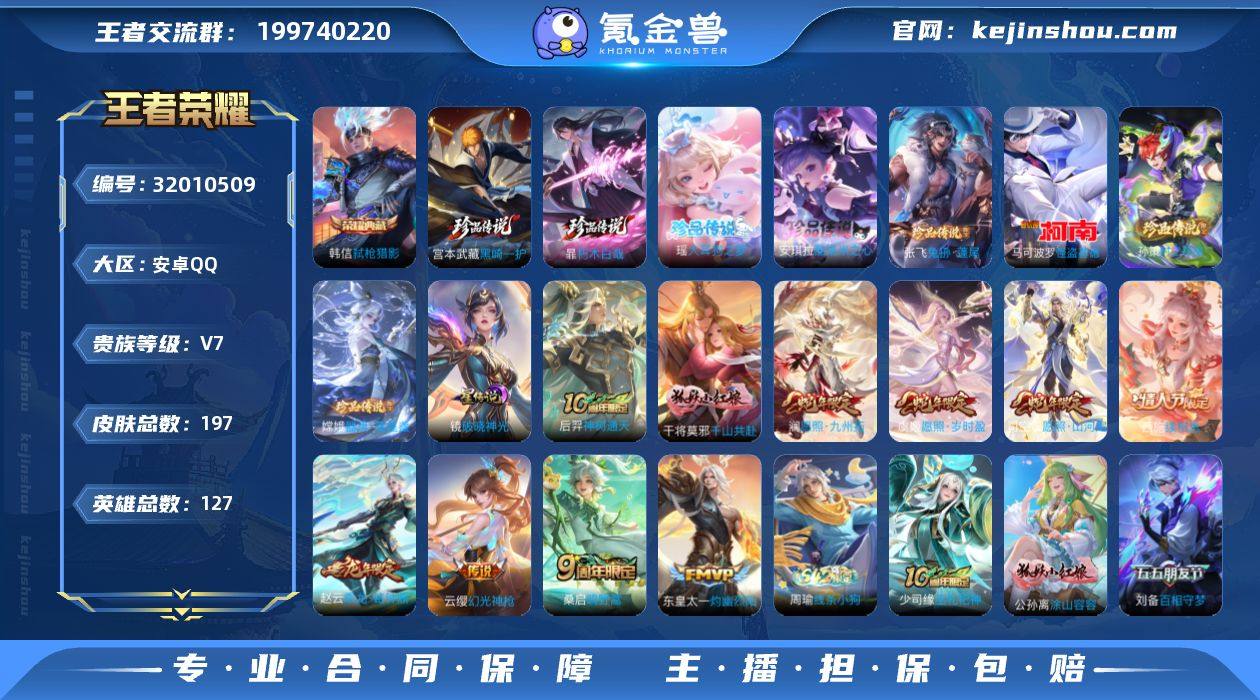 【店长推荐·8珍品·弑枪猎影·镜破晓神光·马可怪盗基德·孙策时之奇旅·器灵落星盏·兔狲蓬尾·瑶大耳狗之梦·酷洛米之心·暃朽木白哉·黑崎一护·续相思·愿照山河定·愿照九州拓·愿照岁时盈·可二次】YXw15047-安卓Q-127英雄-197皮肤-2王者印记-110铭文-贵族积分4w【贵族7】【1典藏·8珍品·1星传说·10传说·20按键·224幸运值】【因赛季更新游戏段付以上号为准!】 【英雄全皮】:戈娅全皮,空空儿全皮,影全皮 【荣耀典藏】:韩信弑枪猎影 【珍品传说】:马可波罗怪盗基德,孙策时之奇旅,嫦娥器灵落星盏,张飞兔狲蓬尾,瑶大耳狗之梦,安琪拉酷洛米之心,暃朽木白哉,宫本武藏黑崎一护 【星元皮肤】:镜破晓神光 【传说皮肤】:后羿神树通天,干将莫邪千山共赴,西施续相思,司空震愿照山河定,澜愿照九州拓,虞姬愿照岁时盈,云缨幻光神枪,桑启鸣野蒿,赵云乘龙铭钟鼎,东皇太一灼幽烈阳 【限定皮肤】:李白谪仙醉月,狄仁杰阴阳师,赵云皇家上将,赵云引擎之心,元歌无心,马可波罗山海玄木吟,狄仁杰魔术师,达摩沙漠行僧,项羽海滩派对,刘备百相守梦,李元芳云中旅人,哪吒逐梦之翼,沈梦溪大漠名商,裴擒虎擒涛扼浪,云中君纤云弄巧,猪八戒西部大镖客,嫦娥拒霜思,西施玲珑珍味,蒙犽狂想玩偶喵,鲁班大师探海日志,镜匿光追影者,桑启海盐诗旅,戈娅驭风魔法,张良古海寻踪,蒙犽百解令,鬼谷子天穹祈灯,赵云乘龙铭钟鼎 【年限皮肤】:马可波罗山海玄木吟,赵云乘龙铭钟鼎,司空震愿照山河定,澜愿照九州拓,虞姬愿照岁时盈 【赛季限定】:达摩沙漠行僧,沈梦溪大漠名商,李元芳云中旅人,桑启海盐诗旅,裴擒虎擒涛扼浪,鲁班大师探海日志,张良古海寻踪,鬼谷子天穹祈灯,东皇太一噬灭天穹,太乙真人谧流熔炉,钟馗虚灵犬护 【战令限定】:猪八戒西部大镖客,蒙犽狂想玩偶喵,戈娅驭风魔法,西施玲珑珍味,亚连破空...