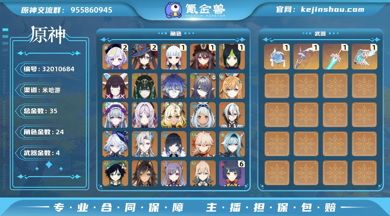 邮箱: 不送邮/死邮 总黄数: 35 冒险等级: 59 2命金色角色: 二命七七,二命莫娜 1命金色角色: 一命神里绫华,一命胡桃,一命提纳里 0命金色角色: 温迪,枫原万叶,优菈,刻晴,琴,夜兰,迪希雅,那维莱特,芙宁娜,阿蕾奇诺,玛拉妮,希诺宁,茜特菈莉,梦见月瑞希,爱可菲,菈乌玛,菲林斯,奈芙尔,哥伦比娅 拥有武器: 天空之卷,阿莫斯之弓,天空之傲,帷间夜曲 1精武器: 天空之卷,阿莫斯之弓,天空之傲,帷间夜曲