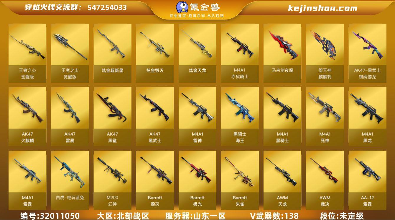 山东一区-142V-8王者-4炫金 【热门武器】:QBZ03-金色蔷薇,M14EBR-玄武,M200-幻神,死亡之眼,白虎-电玩蓝兔,M4A1-黑骑士,汤姆逊-烈龙*8,RPK-盘龙*2,加特林-炼狱,火麒麟-绝迹,USP-雷暴,沙鹰-修罗 【王者炫金武器】:炫金武士,炫金超新星,炫金毁灭,炫金天龙 【音效卡】:天神-动感闪耀 音效卡,AK47-火麒麟音效卡,M4A1-雷神音效卡,M4A1-黑骑士音效卡,Barrett-毁灭音效卡 【皮肤】:幻神-动感闪耀 皮肤,幻神-星火小队签名臻藏版 皮肤,裁决-流光秘银,雷神-能量核心,雷神-荣耀之魄,雷神-星空,雷神-传奇N9,雷神-宇航兔皮肤,火麒麟-AG战队皮肤,火麒麟-华夏之心,AK47-火麒麟-传奇EVEN,火麒麟-轻羽皮肤,火麒麟-平天大圣*2,火麒麟-百城,火麒麟-心动糖果,毁灭耀金皮肤*2,M4A1-千变-孔明皮肤,M4A1-黑龙-361,黑骑士-冠军之势,战神-粉色甜心皮肤,战神-紫绶金章皮肤,战神-流金岁月皮肤,AK47-B-常胜将军-曹操*3,AK47-B-常胜将军-刘备,AK47-B-常胜将军-孙权*2,AWM-天龙-传奇白鲨*2,极光-能量核心,修罗-能量核心*2,擎天-冠军之击 【角色】:葵,樱,魅影,炫,王者-零-国色天香,王者-零,乔伊教练,暗夜-X,初恋灵狐,芳心审判者,风暴女,嘉年华灵狐,娟娟,兰-海滩派对,灵狐者-X,灵狐者-七夕宝贝,灵狐者-职业经理,龙儿,龙儿-小淘气,潘多拉-X,潘多拉-甜心教官,潜龙队-X,斯沃特-X,铁骑荣耀,兔囡囡,影武者-X 【人偶武器】:火麒麟-绝迹,天龙-曼陀罗,AWM-灵狐-15周年嘉年华,迷你牛牛,迷你生化手雷,闪光弹-小乔*2,闪光弹-貂蝉,高爆手雷-大乔,迷你超能女侍 【暴走生化】:死亡之眼 【挑战大师】:神圣爆裂者III,激光毁灭者III*3 【英雄级武器】:AK47-火麒麟*3,M4A1-黑龙,M4A1-雷神*4,M4A1-黑骑士,M4A1-死神*4,AK47-黑武士,AK12-天启*3,AN94-超新星,AK47-黑...