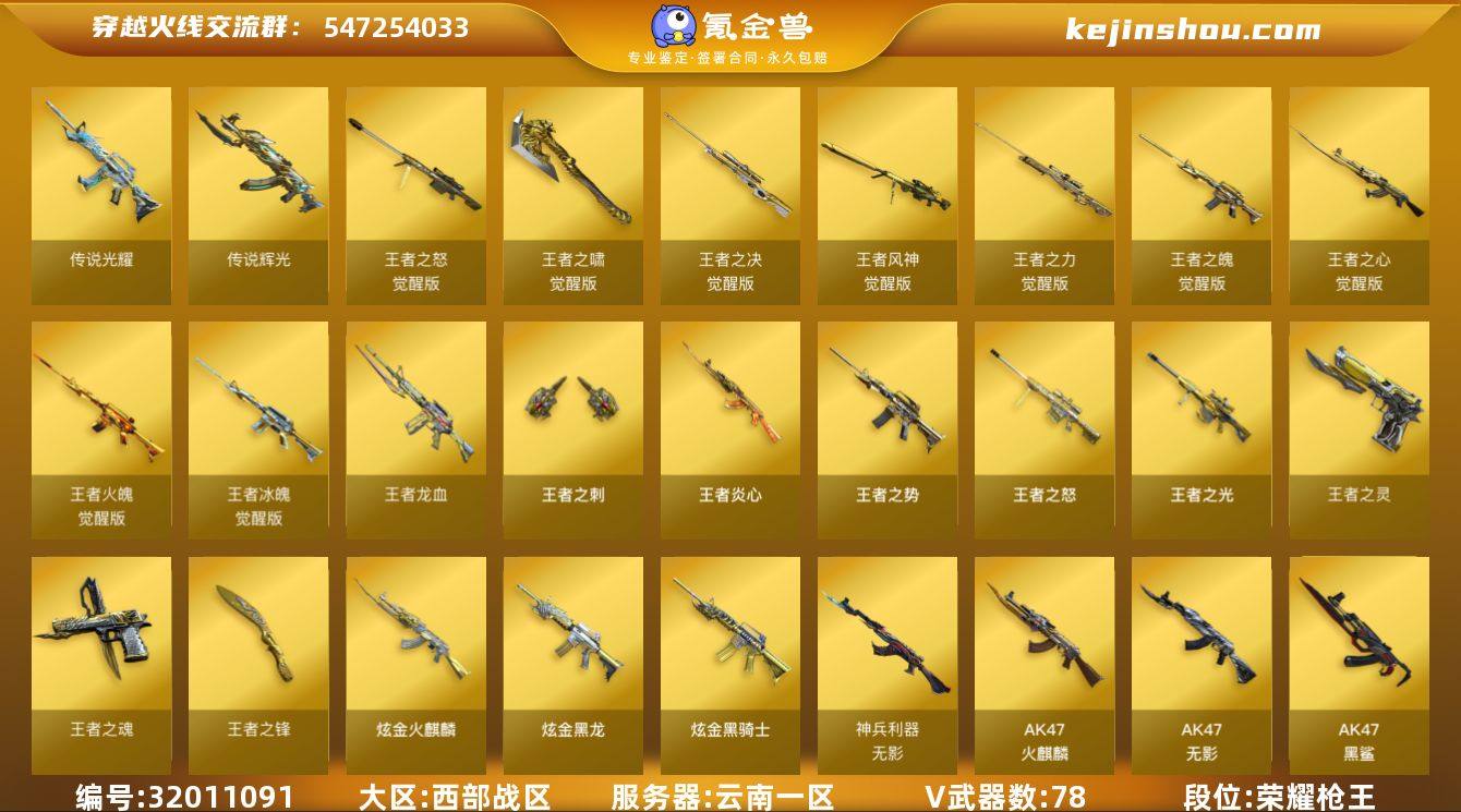 云南一区-93V-21王者武器数-3炫金武器数 【传说武器】:传说光耀,传说辉光 【热门武器】:传说光耀,传说辉光,QBZ03-金色蔷薇,HK417-朱雀,M4A1-青龙*2,M200-幻神,死亡之眼,白虎-电玩蓝兔,王者炎心,M4A1-黑骑士*3,汤姆逊-烈龙*3,RPK-盘龙*2,加特林-炼狱*4,COP-白鲨,沙鹰-修罗*6 【王者炫金武器】:王者炎心,王者之势,王者龙血,王者之光,王者之怒,王者之灵,王者之魂*2,王者之刺,王者之锋*2,炫金火麒麟,炫金骑士,炫金黑龙,王者之魄闪光弹 【音效卡】:M200-幻神音效卡,AK47-火麒麟音效卡,M4A1-雷神音效卡,M4A1-黑骑士音效卡,Barrett-毁灭音效卡,火线妹语音包 【皮肤】:幻神-冠军之幻,幻神-巅峰荣耀,QBZ03-巅峰荣耀皮肤,裁决-流光秘银,AWM-裁决-百城联赛天津皮肤,雷神-暗月,雷神-能量核心,雷神-荣耀之魄,雷神-虎将,雷神-耀金皮肤,雷神-冠军之魄,雷神-维纳斯皮肤,火麒麟-冠军之心,火麒麟-平天大圣,火麒麟-巅峰荣耀,火麒麟-心动糖果,毁灭-荣耀之怒,毁灭耀金皮肤,毁灭-冠军之怒,毁灭-CFS2020,毁灭-BEAN-2020MVP,M4A1-黑龙-361,黑龙-冠军之武,黑骑士-暗月*3,黑骑士耀金皮肤,黑骑士-冠军之势,黑骑士-电玩青兔皮肤,无影-暗月*2,无影-能量核心,无影耀金皮肤,死神-秘银,天启-暗月,战神-粉色甜心皮肤,战神-紫绶金章皮肤,AK47-B-常胜将军-刘备,天龙-秘银,天龙-能量核心,AWM-天龙-传奇70KG,AWM-天龙-传奇白鲨,修罗-能量核心*2,修罗-星空,修罗-冠军之魂*2,屠龙-荣耀之锋 【角色】:零,炫,关小雨,王者-瞳-闭月羞花,乔伊教练,初恋灵狐,风暴女,嘉年华灵狐,兰-空鹰,兰妹妹,灵动武士,灵狐-花神,流浪蔷薇,麻雀,曼陀罗-X,潘多拉-甜心教官,青霞仙子,甜心偶像,蜀雪,维纳斯,樱-青春偶像,职业选手,雅典娜 【人偶武器】:COP-白鲨,M4A1-雷...