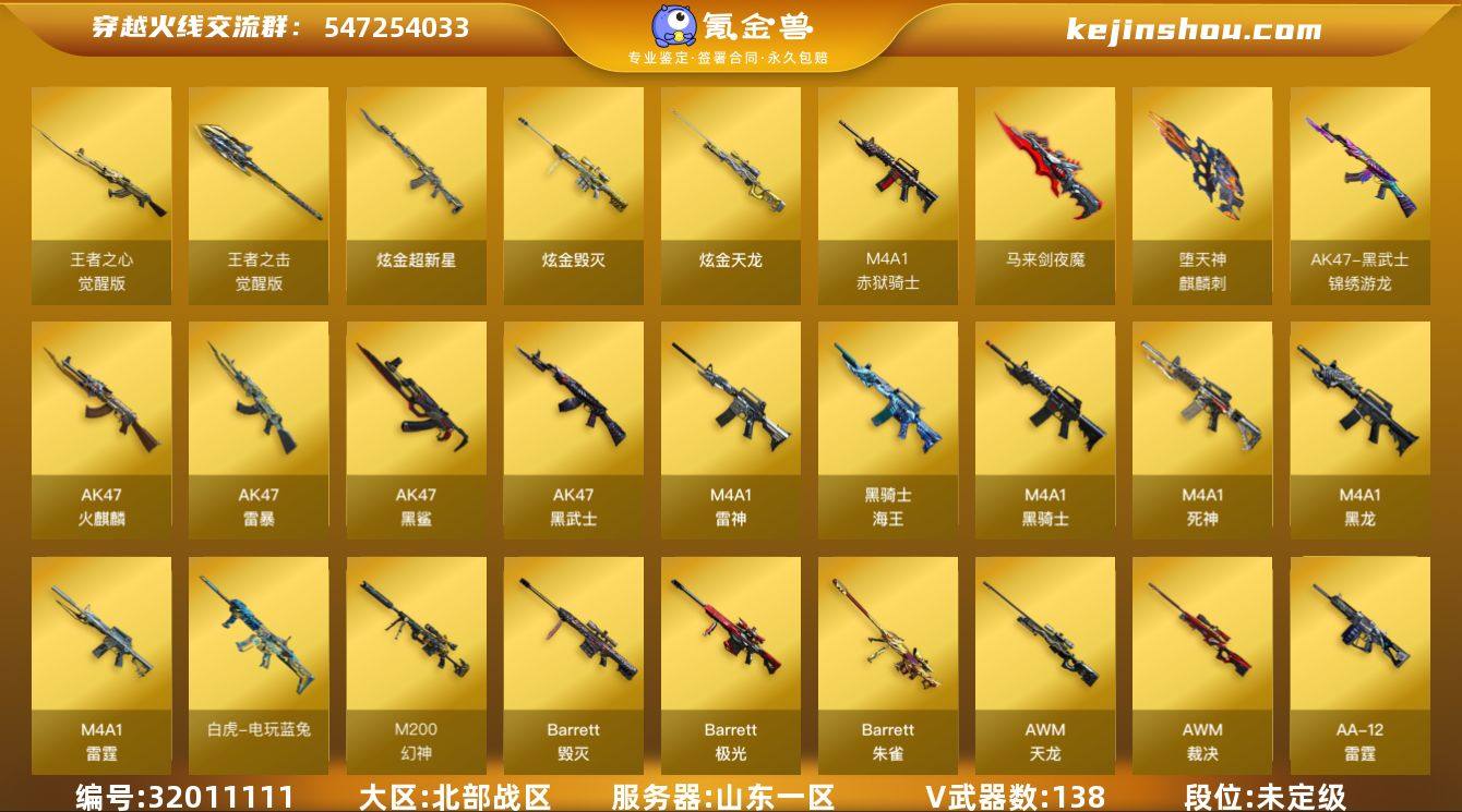 山东一区-142V-8王者-4炫金 【热门武器】:QBZ03-金色蔷薇,M14EBR-玄武,M200-幻神,死亡之眼,白虎-电玩蓝兔,M4A1-黑骑士,汤姆逊-烈龙*8,RPK-盘龙*2,加特林-炼狱,火麒麟-绝迹,USP-雷暴,沙鹰-修罗 【王者炫金武器】:炫金武士,炫金超新星,炫金毁灭,炫金天龙 【音效卡】:天神-动感闪耀 音效卡,AK47-火麒麟音效卡,M4A1-雷神音效卡,M4A1-黑骑士音效卡,Barrett-毁灭音效卡 【皮肤】:幻神-动感闪耀 皮肤,幻神-星火小队签名臻藏版 皮肤,裁决-流光秘银,雷神-能量核心,雷神-荣耀之魄,雷神-星空,雷神-传奇N9,雷神-宇航兔皮肤,火麒麟-AG战队皮肤,火麒麟-华夏之心,AK47-火麒麟-传奇EVEN,火麒麟-轻羽皮肤,火麒麟-平天大圣*2,火麒麟-百城,火麒麟-心动糖果,毁灭耀金皮肤*2,M4A1-千变-孔明皮肤,M4A1-黑龙-361,黑骑士-冠军之势,战神-粉色甜心皮肤,战神-紫绶金章皮肤,战神-流金岁月皮肤,AK47-B-常胜将军-曹操*3,AK47-B-常胜将军-刘备,AK47-B-常胜将军-孙权*2,AWM-天龙-传奇白鲨*2,极光-能量核心,修罗-能量核心*2,擎天-冠军之击 【角色】:葵,樱,魅影,炫,王者-零-国色天香,王者-零,乔伊教练,暗夜-X,初恋灵狐,芳心审判者,风暴女,嘉年华灵狐,娟娟,兰-海滩派对,灵狐者-X,灵狐者-七夕宝贝,灵狐者-职业经理,龙儿,龙儿-小淘气,潘多拉-X,潘多拉-甜心教官,潜龙队-X,斯沃特-X,铁骑荣耀,兔囡囡,影武者-X 【人偶武器】:火麒麟-绝迹,天龙-曼陀罗,AWM-灵狐-15周年嘉年华,迷你牛牛,迷你生化手雷,闪光弹-小乔*2,闪光弹-貂蝉,高爆手雷-大乔,迷你超能女侍 【暴走生化】:死亡之眼 【挑战大师】:神圣爆裂者III,激光毁灭者III*3 【英雄级武器】:AK47-火麒麟*3,M4A1-黑龙,M4A1-雷神*4,M4A1-黑骑士,M4A1-死神*4,AK47-黑武士,AK12-天启*3,AN94-超新星,AK47-黑...