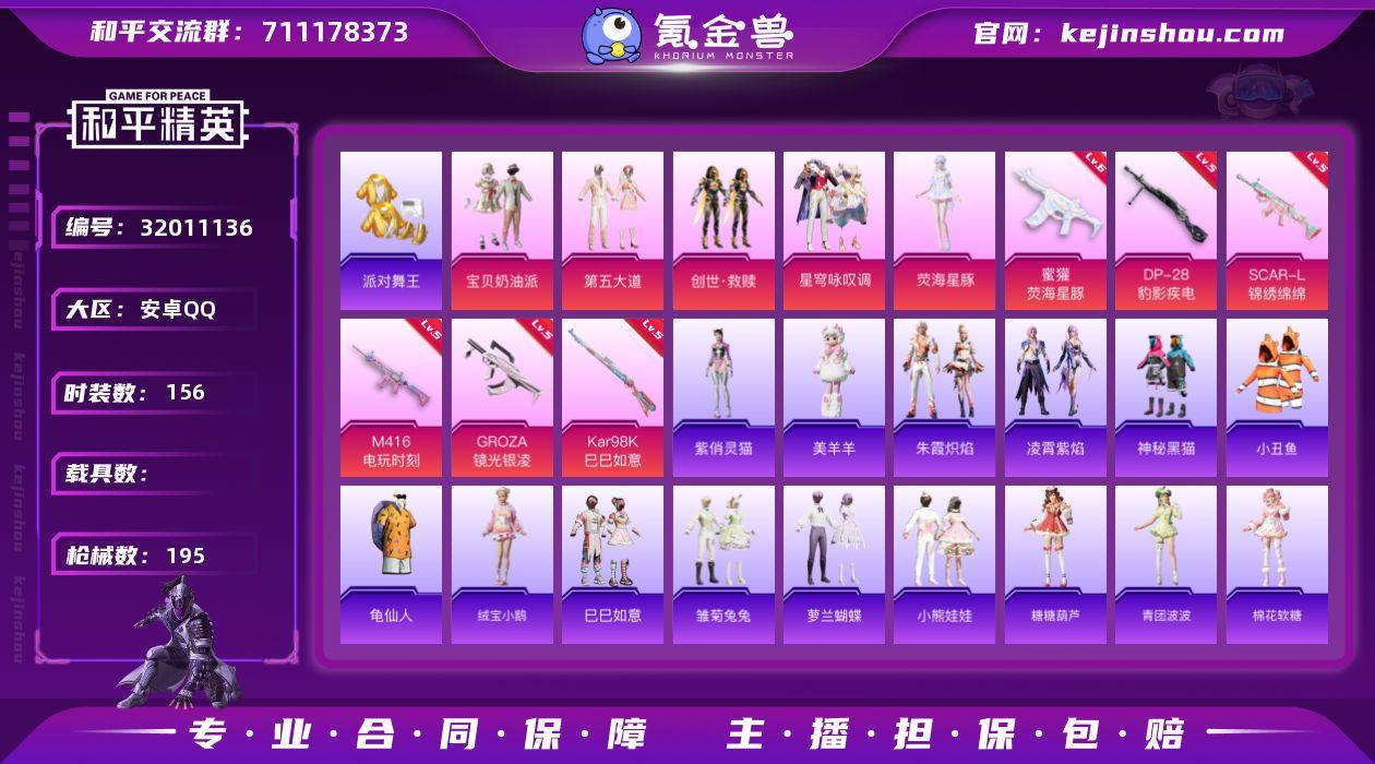 安卓 手Q-5粉装-7特效枪-0载具-0粉色飞行器-58641热力值-12王牌印记-156套装-195枪皮 【热门品类】:套装-派对舞王,套装-小丑鱼,套装-龟仙人 【粉色套装】:粉装-宝贝奶油派,粉装-第五大道,套装-创世·救赎,粉装-星穹咏叹调,角色-荧海星豚 【粉色枪皮等级】:SCAR-L-锦绣绵绵(五级),M416-电玩时刻(五级),GROZA-镜光银凌(五级),蜜獾-荧海星豚(六级),Kar98K-巳巳如意(五级),Mk14-福马献瑞(四级),DP-28-豹影疾电(五级) 【粉色枪皮】:SCAR-L-锦绣绵绵,M416-电玩时刻,GROZA-镜光银凌,蜜獾-荧海星豚,Kar98K-巳巳如意,Mk14-福马献瑞,DP-28-豹影疾电 【粉色降落伞】:甜心宝贝降落伞,洛神天依降落伞,旋转彩虹降落伞,音爆索尼克降落伞,仲夏莫吉托降落伞,未来歌姬降落伞,守护天翼降落伞,幻彩电音降落伞,荧海星豚降落伞,无垠阁降落伞,炫彩糖果降落伞 【稀有套装】:套装-龟仙人,套装-绒宝小鹅,套装-巳巳如意,套装-马上有钱,套装-雏菊兔兔,套装-萝兰蝴蝶,套装-小熊娃娃,套装-糖糖葫芦,套装-青团波波,套装-棉花软糖,角色-都市丽猫,套装-燕燕于飞,套装-鱼渊荷华,套装-晶辉守护,套装-雪夜云雾,套装-晨曦轻云,套装-风舞幻音,套装-粉恋花,套装-紫幽梦,套装-蓝冰羽,套装-霓虹热舞,套装-彩虹兔,套装-云朵鹅,套装-雪绒豹,套装-蓝海鲸歌,套装-朱霞炽焰,套装-凌霄紫焰,玩偶服-美羊羊,角色-紫俏灵猫,角色-曹焱兵 【稀有枪皮】:AKM-彩虹符号,AKM-破晓战魂,AKM-龙的传人,M16A4-幻世战舞者,M16A4-红色方程式,M16A4-蓝色火焰,SCAR-L-玉兔迎春,SCAR-L-甜蜜誓约,SCAR-L-红色方程式,SCAR-L-冷漠罗丽,M416-糯团青竹,M416-红色方程式,M416-绯红前夜,M416-蓝色火焰,GROZA-彩虹符号,GROZA-影袭,GROZA-懵萌河马,GROZA-田园牧歌,GROZA-荧海星豚,AUG-天降萌叽,AUG-甜蜜...
