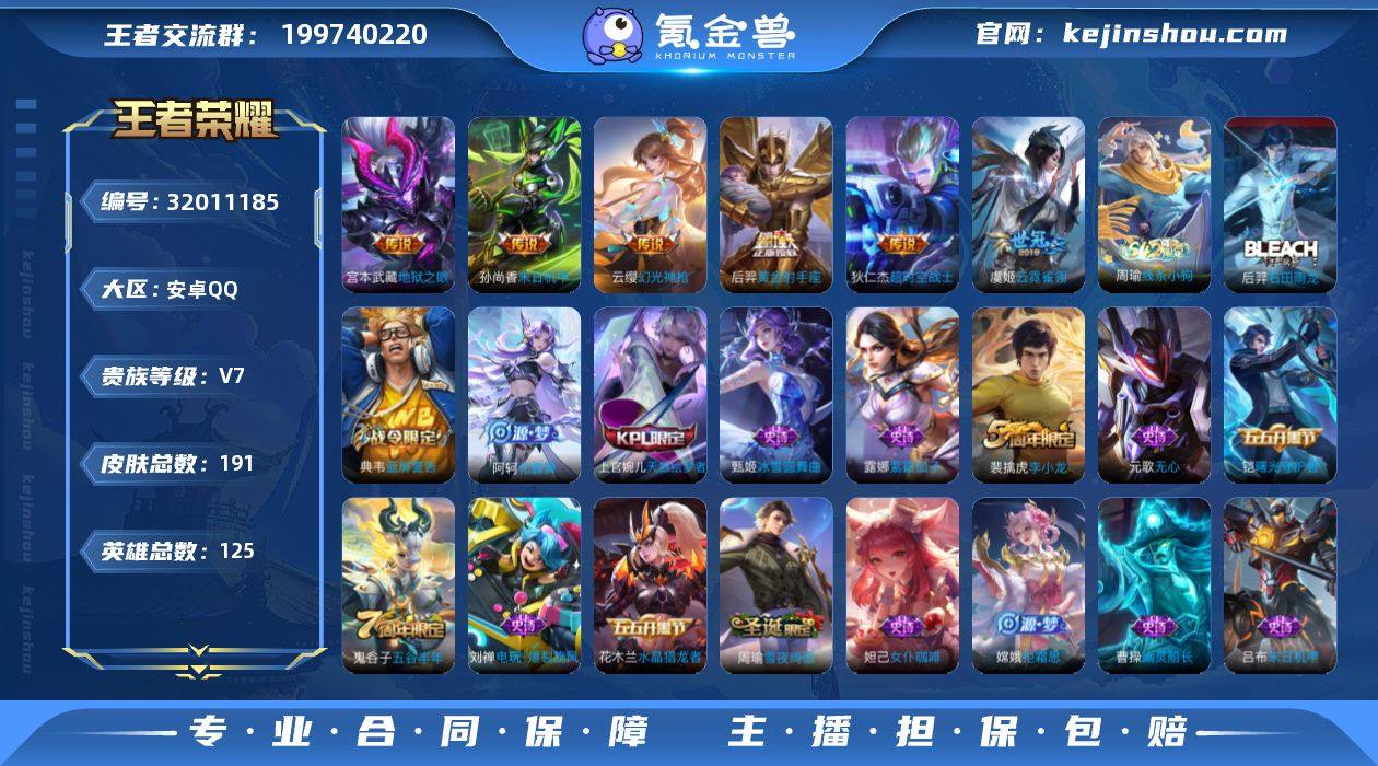 安卓Q-V7-永恒钻石I段位-125英雄-191皮肤-6传说-45史诗 【传说皮肤】:云缨幻光神枪,虞姬云霓雀翎,后羿黄金射手座,孙尚香末日机甲,宫本武藏地狱之眼,狄仁杰超时空战士 【限定皮肤】:狄仁杰阴阳师,赵云皇家上将,孙尚香蔷薇恋人,庄周高山流水,芈月重明,元歌无心,夏侯惇朔风刀,甄姬游园惊梦,曹操烛龙,典韦穷奇,典韦蓝屏警告,狄仁杰魔术师,狄仁杰万华元夜,达摩沙漠行僧,项羽海滩派对,老夫子醍醐杖,程咬金演武夺筹,兰陵王金庭之子,牛魔御旌,李元芳云中旅人,钟馗驱傩正仪,女娲朔望之晖,干将莫邪胡桃夹子,蔡文姬繁星吟游,鬼谷子原初探秘者,鬼谷子五谷丰年,苏烈千军破阵,弈星混沌棋,沈梦溪大漠名商,明世隐疑决卦,裴擒虎李小龙,裴擒虎擒涛扼浪,狂铁御狮,米莱狄御霄,云中君纤云弄巧,盾山御銮,上官婉儿梁祝,上官婉儿天狼绘梦者,嫦娥拒霜思,鲁班大师探海日志,桑启海盐诗旅,阿古朵江河有灵,张良古海寻踪,蒙犽百解令,鬼谷子天穹祈灯,刘邦剑破天穹,刘备异域游侠,周瑜熔金海岸 【赛季限定】:曹操烛龙,芈月重明,典韦穷奇,狂铁御狮,米莱狄御霄,牛魔御旌,盾山御銮,夏侯惇朔风刀,弈星混沌棋,明世隐疑决卦,老夫子醍醐杖,鬼谷子原初探秘者,狄仁杰万华元夜,程咬金演武夺筹,钟馗驱傩正仪,苏烈千军破阵,达摩沙漠行僧,兰陵王金庭之子,沈梦溪大漠名商,李元芳云中旅人,桑启海盐诗旅,裴擒虎擒涛扼浪,鲁班大师探海日志,张良古海寻踪,鬼谷子天穹祈灯,刘邦剑破天穹,太乙真人谧流熔炉 【战令限定】:典韦蓝屏警告,女娲朔望之晖,周瑜线条小狗 【史诗皮肤】:周瑜线条小狗,后羿石田雨龙,阿轲化蝶舞,周瑜雪夜绮愿,蒙犽百解令,阿古朵江河有灵,刘禅电玩爆裂旋风,元歌无心,鬼谷子五谷丰年,嫦娥拒霜思,庄周高山流水,云中君纤云弄巧,裴擒虎李小龙,上官婉儿...