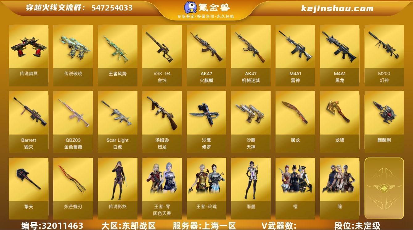 5822/东部/上海一区/可排位/段位未定段/Lv.100 高阶大元帅/VIP6/55V/【四传说】/【四防传说】/完美生化传说影煞/传说幽瞳/传说幽冥/传说破晓/幻神/白虎/QBZ金色蔷薇/VSK94金蚀/烈火动感闪耀套/COP雷霆王者/炽芒蝶刃/炽芒蝶刃宋雨琦/5烈龙/【音效卡】/毁灭音效卡/修罗云海游龙音效卡/【枪皮】/毁灭英雄计划/毁灭墨兰/火麒麟心动糖果/火麒麟轻羽/【四防】/王者零国色天香/【角色】/樱/瞳/雨墨/奇洋探员/乔伊教练/云海玲珑/电竞少女/【小人枪】/C.A.T/Cat刀锋/斯泰尔幻面灵狐/【道具】/永久烟雾头/护目镜/超级背包/各种戒指/各种光效/各种玩偶/永久AC/永久雷包/细节看图/【此账号未被封过十年】