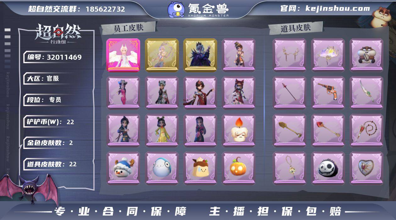 粉皮1;金皮2;紫皮9;道具皮22;皮肤:小黄-炽天使,逍遥-莲华渡,零-渡鸦公爵,小黄-呱呱雨衣,逍遥-绣春逍影,阿念-庆宴绮愿,莉莉-莓果陷阱,爱丽丝-丝缕哀歌,艾伦-黎明猎手,薇薇安-仙锋小姐,巫铃儿-琢玉怀乡,爱丽丝-耀眼的你;道具:转轮手枪-新星时代,黄牛能量饮料-青玉抱丹,急救包-蔷薇物语,额外的背包-灵感泉之花,摸金符-紫霄,急救包-土拨鼠捏捏,腰包-宝剑八,铲子-圣心之泪,刺刀-碧络琅环,夜视仪-敛花容,腰包-红运福虎,铲子-龙鳞,音响-happy猫,音响-月光奏鸣曲,长鞭-缚誓之锁,短管猎枪-赞萌露比水枪,音响-鸣沙鼓,腰包-惊魂娃娃,电击枪-权杖的许诺,摸金符-海洋之心,折扇-赴此良宵,长枪-罪棘;美妆:美妆-天使之泪,美妆-萌兔气泡;饰品:头饰-嘻嘻头套,头饰-小狗蛇点点头套,头饰-惊魂南瓜头套,头饰-烛光纪念,头饰-蒜了八,头饰-哈士奇头套,头饰-呆滞头套,头饰-滑稽头套,头饰-太空鲨头套,头饰-卑微头套,头饰-面具马头套,头饰-鱼头怪头套,头饰-火爆了头套,头饰-萨卡班甲鱼头套,头饰-炙热烧烤,头饰-马上有钱,头饰-烈焰红唇头套,头饰-大葱明头套,头饰-小财神豚豚头套,头饰-雪墩墩头套,头饰-饺饺者头套,头饰-樱桃奶油布丁,头饰-粽小宝头套,头饰-像素朋克墨镜,头饰-后室幸存者头套,挂饰-糖果守卫,挂饰-天使消失的年代,挂饰-晚安小熊,挂饰-拂云仙,挂饰-钗头凤,挂饰-孤独对望,背饰-白鼬趴趴,背饰-蝶恋花,背饰-牛啤背包;动作:动作-刀马舞,动作-知世摇,动作-不孬摇,动作-舞台中心,动作-luvaboy,动作-抖肩舞,动作-新年摇,动作-鹏友摇,动作-姬芽摇,动作-抬手,动作-蝴蝶步,动作-要糖,动作-旋转舞,动作-举牌,动作-KT猫摇,动作-带你逃跑吧,动作-拜年;工牌背景:工牌背景-珊瑚海,工牌背景-卷珠帘,工牌背景-甜心的囚笼,工牌背景-永恒之阶,工牌背景-春和景明,工牌背景-鸢尾花,工牌背景-琢玉成佩,工牌背景-童话扉页,工牌背景-永夜巡...