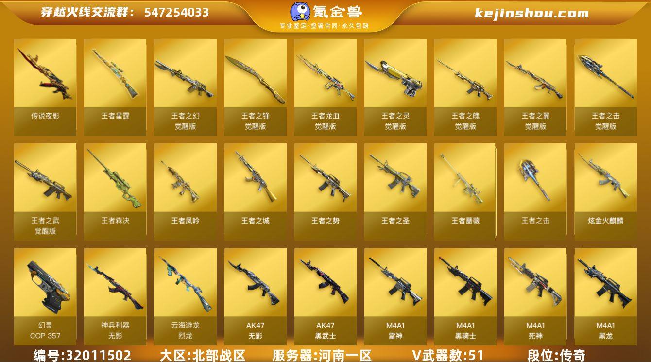 河南一区-62V-21王者武器数-1炫金武器数 【传说武器】:传说夜影 【热门武器】:传说夜影,王者森决,QBZ03-金色蔷薇,M200-幻神,白虎-电玩蓝兔,C.A.T,Cat-刀锋,M4A1-黑骑士,毁灭-孙三炮,COP 357-幻灵*2,沙鹰-修罗,Knife-冠军之刃 【王者炫金武器】:王者之圣,王者之城,王者之势,王者凤吟,王者蔷薇,王者森决,王者星霆,王者之击*2,炫金火麒麟,王者之魄闪光弹 【皮肤】:幻神-冠军之幻,幻神-青鹤,M200-幻神-荣耀世冠白鲨,QBZ03-巅峰荣耀皮肤,雷神-R.LGD-CFPLS18冠军,雷神-机甲刑天皮肤,雷神-宇航兔皮肤,M4A1-雷神-巅峰荣耀皮肤,毁灭-冠军之怒,毁灭-战神张飞,毁灭-英雄计划 皮肤,黑龙-能量核心,黑龙-冠军之武,黑骑士耀金皮肤,黑骑士-AG-S4冠军典藏,无影-霓裳皮肤,战神-流金岁月皮肤*2,AK47-B-常胜将军-曹操,AK47-B-常胜将军-刘备*2,修罗-冠军之魂,龙啸-冠军之啸 【角色】:零,影豹,王者-零-国色天香,王者-葵-貂蝉,蛇隐宗,奇洋探员,乔伊教练,云海玲珑,北极狐-X,芳心审判者,风暴女,嘉年华灵狐,零-热舞青春,灵狐者-七夕宝贝,麻雀,曼陀罗-X,潘多拉-甜心教官,蛇姬,斯沃特-X,兔囡囡,樱-战斗天使 【人偶武器】:毁灭-孙三炮,巴雷特-零-水下丽影,AWM-灵狐-15周年嘉年华,COP-旗袍,C.A.T,Cat-刀锋,迷你牛魔王,黄金迷你裂空之翼,迷你波特博士,夺魂,生化手雷-机甲核心*2,深渊终结者手雷,迷你超能女侍 【挑战大师】:激光毁灭者III,神圣爆裂者-末日III 【英雄级武器】:M4A1-千变,M4A1-黑龙,M4A1-雷神,M4A1-黑骑士,AK47-无影*2,M4A1-死神,AK47-黑武士,M4A1-幻灵,无影-神兵利器,QBZ03-金色蔷薇,烈火-动感闪耀,王者之翼-觉醒版,王者之武-觉醒版,王者之魄-觉醒版,王者之幻-觉醒版,AK47-B-战神,王者龙血-觉醒版,白虎-电玩蓝兔,Barrett-毁灭...