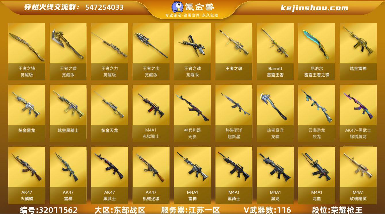 江苏一区-129V-14王者武器数-5炫金武器数 【热门武器】:QBZ03-金色蔷薇,Scar Light-白虎,M200-幻神,死亡之眼*2,M4A1-黑骑士,汤姆逊-烈龙*5,加特林-炼狱,降世魔童,USP-雷暴,沙鹰-修罗*4,炽芒蝶刃 【王者炫金武器】:王者之怒,Barrett-雷霆王者,雷霆王者之锋,炫金骑士,炫金黑龙,炫金雷神*2,炫金天龙 【音效卡】:M4A1-黑骑士音效卡,Barrett-毁灭音效卡 【皮肤】:白虎-大汉风骨,雷神-暗月,雷神-星空,雷神-维纳斯皮肤,火麒麟-雷神,火麒麟-冠军之心,毁灭耀金皮肤,毁灭-星空,毁灭-英雄计划 皮肤,黑龙-能量核心,黑龙-墨子皮肤,黑骑士-暗月,AK47-黑武士-361,战神-紫绶金章皮肤*6,战神-流金岁月皮肤,天龙-秘银*2,极光-能量核心*2,修罗-能量核心,屠龙-春桃 皮肤 【角色】:零,炫,春,审判者,王者-瞳-闭月羞花,堕落女神,奇洋探员,修道士,云海玲珑,暗夜-X,初恋灵狐,电竞少女,飞虎队-X,风暴女,嘉年华灵狐,兰-新年限定,猎狐者-追月,0号玩家,零-水下丽影,灵狐-花神,灵狐者-黄金海岸,灵狐者-职业经理,龙儿,麻雀,曼陀罗-X,曼陀罗-礼服,潘多拉-X,潘多拉-甜心教官,青霞仙子,蛇姬,蜀雪,铁骑荣耀,兔囡囡,新娜塔莎,雪莉杨,雪莉杨-摸金校尉,夜玫瑰-幻能朋克,影武者-X,游珑儿 【人偶武器】:星神-炽天使,AWM-灵狐-15周年嘉年华,COP-旗袍,迷你深渊冰龙,闪光弹-小乔,迷你超能女侍,降世魔童 【暴走生化】:死亡之眼*2,超级对讲机 【挑战大师】:神圣爆裂者III,AK47-冰龙粉碎者,激光毁灭者III-白马银枪,激光毁灭者III,阐释者III 【英雄级武器】:AK47-火麒麟,M4A1-黑龙*3,M4A1-雷神*3,M4A1-黑骑士,AK47-黑武士,AK12-天启,AK47-机械迷城,M4A1-龙血,AK47-雷暴,Scar Light-白虎,无影-神兵利器,黑武士-锦绣游龙,超新星-热带奇洋,M4A1-玫瑰精灵...