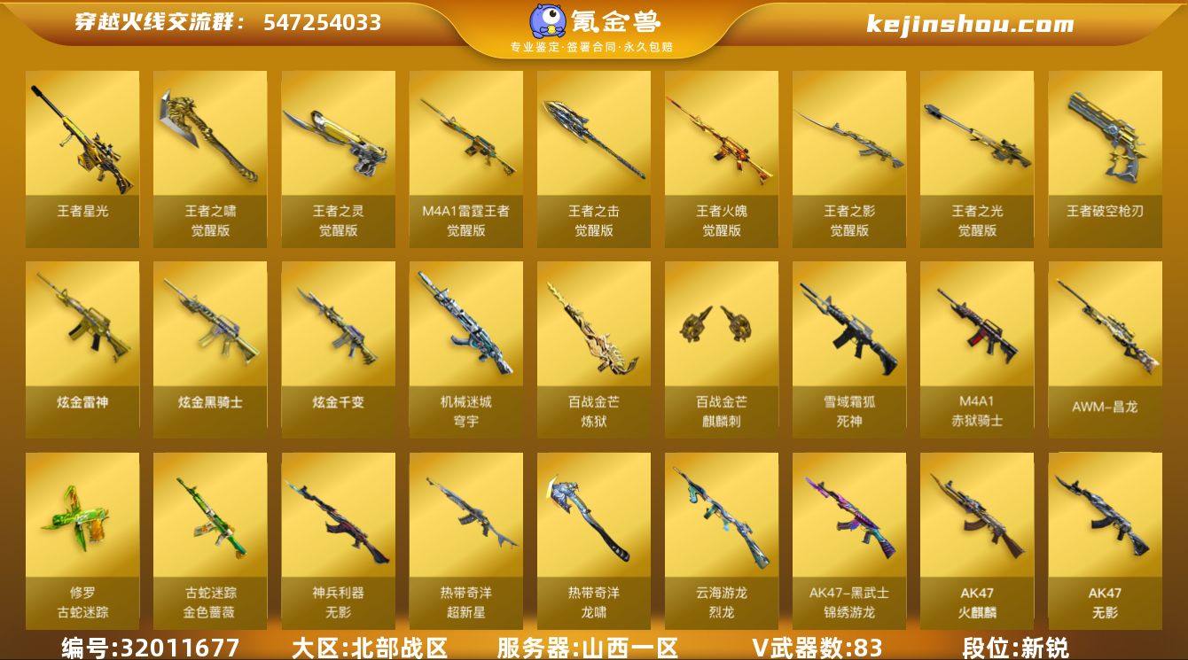 山西一区-93V-11王者武器数-3炫金武器数 【热门武器】:QBZ03-金色蔷薇,M200-幻神,金色蔷薇-古蛇迷踪,修罗-古蛇迷踪,死亡之眼,白虎-电玩蓝兔,Cat-刀锋,M4A1-黑骑士,汤姆逊-烈龙*5,RPK-盘龙,加特林-炼狱*2,沙鹰-修罗 【王者炫金武器】:王者星光,王者破空枪刃,炫金骑士,炫金千变,炫金雷神 【音效卡】:屠龙-动感闪耀 音效卡,M4A1-雷神音效卡,M4A1-黑骑士音效卡,Barrett-毁灭音效卡,Barrett-极光音效卡,QBZ03-金色蔷薇音效卡,炼狱-百战金芒-庆典舞曲音效卡,死神-雪域霜狐-怀旧音效卡,M4A1-雷神-怀旧音效卡,AK47-火麒麟-怀旧音效卡 【皮肤】:幻神-电竞之星 皮肤,雷神-暗月,雷神-虎将*2,雷神-烈虎皮肤,雷神-宇航兔皮肤,雷神-源计划2.0专属 皮肤,雷神-化蛇 皮肤,M4A1-再燃火线,火麒麟-雷神,火麒麟-轻羽皮肤,火麒麟-平天大圣*2,火麒麟-百城,火麒麟-心动糖果,毁灭-暗月,毁灭-星空,毁灭-黑大圣皮肤*2,毁灭-魔灵皮肤,毁灭-百城浙江 皮肤,黑骑士-暗月,无影耀金皮肤,天启-暗月,战神-粉色甜心皮肤*2,战神-流金岁月皮肤,AK47-B-常胜将军-曹操*2,AK47-B-常胜将军-刘备,AK47-B-常胜将军-孙权,极光-能量核心,修罗耀金皮肤,屠龙-春桃 皮肤,龙啸-蛇姬 皮肤,轻型军用手斧-再燃火线,麒麟刺-萌杀皮肤 【角色】:樱,瞳,影豹,关小雨,零·纪元,战地猎狐,王者零-华冠丽服,王者-零-国色天香,王者春,雪域霜狐,蛇隐宗,奇洋探员,乔伊教练,修道士,云海玲珑,葵-阿尔法武装,暗夜-X,北极狐-X,初恋灵狐,芳心审判者,飞虎队-X,风暴女*2,嘉年华灵狐,疾风,兰-海滩派对,兰-新年限定,零-水下丽影,灵狐者-X,灵狐者-黄金海岸,灵狐者-七夕宝贝,龙儿-小淘气,麻雀,萌儿,女战神,潘多拉-X,潘多拉-甜心教官,潜龙队-X,邱刚敖,青霞仙子,蛇姬,斯沃特-X,蜀雪,铁骑荣...