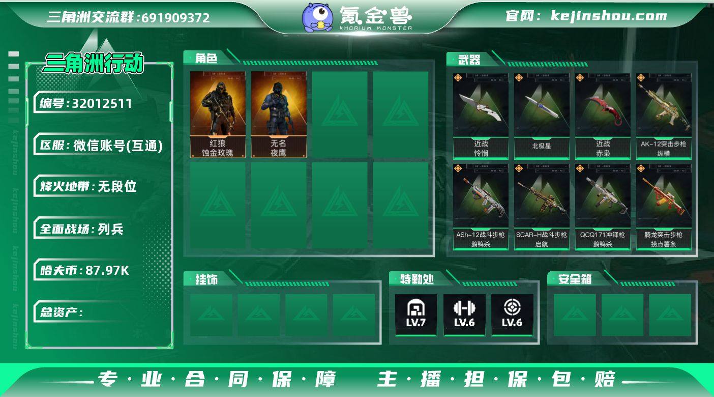 【PTSJZ2919】197m总资产-87977k哈伏币-60烽火等级-钻石-40战场等级-列兵 【干员外观】:红狼-蚀金玫瑰,无名-夜鹰,深蓝-不破誓约,红狼-电锯惊魂 【近战皮肤】:近战-北极星,近战-怜悯,近战-赤枭,近战-黑鹰 【典藏外观】:SCAR-H战斗步枪-电玩高手,QBZ95-1突击步枪-王牌之剑 【典藏外观成色】:SCAR-H战斗步枪-电玩高手(优品B),QBZ95-1突击步枪-王牌之剑(优品C) 【传说外观】:M4A1突击步枪-蚀金玫瑰,M4A1突击步枪-阿米娅,AKM突击步枪-锦绣,ASh-12战斗步枪-鹅鸭杀,AK-12突击步枪-夜鹰,AK-12突击步枪-特斯拉线圈,SCAR-H战斗步枪-启航,CAR-15突击步枪-阿米娅,腾龙突击步枪-捞点薯条,腾龙突击步枪-马年祥瑞,腾龙突击步枪-万金泪冠,K437突击步枪-北极星,K437突击步枪-锦绣,KC17突击步枪-电锯惊魂,UZI冲锋枪-特斯拉线圈,SMG-45冲锋枪-骑士,SMG-45冲锋枪-锦绣,SR-3M紧凑突击步枪-特斯拉线圈,勇士冲锋枪-能天使-午夜邮差,勇士冲锋枪-万金泪冠,QCQ171冲锋枪-北极星,QCQ171冲锋枪-鹅鸭杀,M250通用机枪-骑士之心,QJB201轻机枪-鹅鸭杀,M14射手步枪-缄花,SKS射手步枪-骑士,SR-25射手步枪-水墨云图,SR-25射手步枪-缄花,AWM狙击步枪-捞点薯条,AWM狙击步枪-万金泪冠,.357左轮-缄花,G18-马年祥瑞,93R-捞点薯条 【史诗外观】:AKM突击步枪-林中猎手,AKM突击步枪-逆战未来,QBZ95-1突击步枪-曙光,ASh-12战斗步枪-守夜人,ASh-12战斗步枪-无极限,K416突击步枪-冬日风情,M16A4突击步枪-竞赛选手,AUG突击步枪-蝮蛇,SG552突击步枪-尖端治疗,SG552突击步枪-深海恐惧,SG552突击步枪-哈夫克警备,SCAR-H战斗步枪-囚徒,G3战斗步枪-战场英杰,G3战斗步枪-哈夫克警备,AS Val突击步枪-尖端治疗,腾龙突击步枪-猎鳄行动,K437突击步枪-守护者,