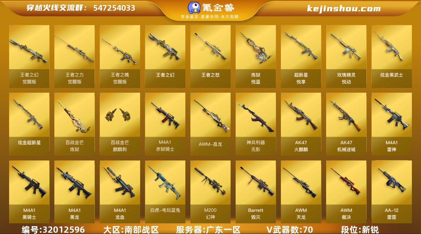 【ky5176】广东一区-75V-8王者-2炫金 【热门武器】:QBZ03-金色蔷薇,HK417-朱雀,M200-幻神,荣耀世冠-雷神,白虎-电玩蓝兔,炼狱-迷你小钢,M4A1-黑骑士,汤姆逊-烈龙*5,RPK-盘龙,火麒麟-绝迹,沙鹰-修罗*4 【王者炫金武器】:超新星-悦享,王者之幻,玫瑰精灵-悦动,王者之怒,炼狱-悦蓝,炫金武士,炫金超新星 【音效卡】:屠龙-动感闪耀 音效卡,天神-动感闪耀 音效卡,烈火-动感闪耀 音效卡,M200-幻神音效卡,Barrett-毁灭音效卡,Barrett-碧霄极光音效卡,炼狱-百战金芒-庆典舞曲音效卡,AWM-昌龙-怀旧音效卡 【皮肤】:M200-幻神-黄忠皮肤,幻神-丹凤,幻神-动感闪耀 皮肤,白虎-百战金芒 皮肤,金色蔷薇-电竞之星 皮肤,雷神-能量核心,雷神-荣耀之魄,雷神-星空,雷神-宇航兔皮肤,M4A1-再燃火线,火麒麟-雷神,火麒麟-战神关羽,火麒麟-荣耀世冠AG,火麒麟-心动糖果,毁灭-荣耀之怒,毁灭-星空,毁灭-战神张飞,毁灭-黑大圣皮肤,毁灭-巅峰荣耀 皮肤,毁灭-英雄计划 皮肤,黑骑士-暗月*2,无影耀金皮肤,战神-紫绶金章皮肤*2,AWM-天龙-传奇70KG,AWM-天龙-传奇白鲨*2,屠龙-荣耀之锋,屠龙-荣耀世冠AG,屠龙-巅峰荣耀 皮肤,轻型军用手斧-再燃火线 【角色】:樱,炫,战地猎狐,空,初恋灵狐,嘉年华灵狐,灵狐者-X,灵狐者-黄金海岸,灵狐者-七夕宝贝,龙儿-小淘气,曼陀罗-礼服,潘多拉-X,青霞仙子,斯沃特-X,铁骑荣耀,兔囡囡,樱-战斗天使 【人偶武器】:火麒麟-绝迹,炼狱-迷你小钢,AWM-灵狐-15周年嘉年华*2,夺魂,深渊终结者手雷,迷你超能女侍 【暴走生化】:超级对讲机 【挑战大师】:神圣爆裂者III,冰龙粉碎者-白马银枪,神圣爆裂者-末日III 【英雄级武器】:AK47-火麒麟*2,M4A1-黑龙,M4A1-雷神*3,M4A1-黑骑士,AN94-超新星,AK47-机械迷城,M4A1-龙血,HK417-朱雀,无影-神兵利...