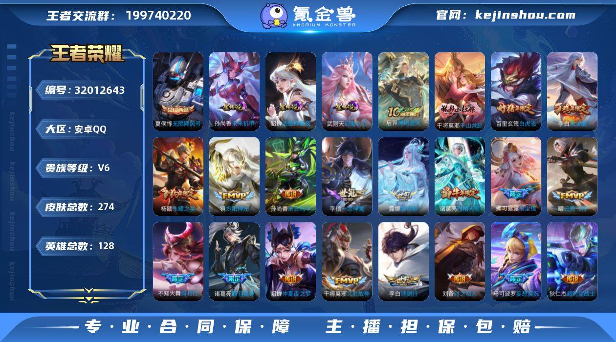 贵族6/皮肤274/典藏1/传说23/史诗83/英雄128/孙权全皮/娜可露露全皮/影全皮/武则天/无限飓风号/幻海之心/金色仲夏夜/未来机甲/神树通天/千山共赴/霜月吟/妄想实况/鹤羽星尊/诗剑行/绯月行/前尘镜/音你心动-周瑜/时雨天司/炽阳神光/启明星使/云鹰飞将/一念神魔/时之恋人-刘备/久胜战神/白虎志/永曜之星/仲夏夜之梦/凤求凰/末日机甲-孙尚香/海洋之心/超时空战士-狄仁杰/狰(s8)/阴阳师/凯尔特女王(s7)/皇家上将/引擎之心/优雅恋人/白昼王子/狮舞东方/玩趣恶龙/炼金王(s6)/重明(s11)/白晶晶/猎兽之王/赤莲之焰/云间偶戏/朔风刀(s17)/游园惊梦/烛龙(s10)/穷奇(s12)/蓝屏警告/逐梦之星/暗影游猎/魔术师/万华元夜(s22)/沙漠行僧(s26)/海滩派对/霸王别姬-项羽/醍醐杖(s20)/冰锋战神/演武夺筹(s23)/逐梦之影/驯魔猎人/金庭之子(s27)/青春决赛季/潮玩骑士王/至尊宝/御旌(s15)/百相守梦(刘备)/银河之约/云中旅人(s29)/霸王别姬-虞姬/神迹守卫-钟馗/驱傩正仪(s24)/遇见飞天/朔望之晖/黎明之约/繁星吟游/饕餮(s9)/原初探秘者(s21)/五谷丰年/原初追遂者/混沌棋(s18)/顽趣-梦奇/蜜橘之夏/星空之诺/大漠名商(s28)/疑决卦(s19)/李小龙/擒涛扼浪(s31)/御狮(s13)/御霄(s14)/纤云弄巧/天狼溯光者/御銮(s16)/西部大镖客-猪八戒/梁祝/探海日志(s32)/海盐诗旅(s30)/古海寻踪(s33)/梅西/鬼谷子天穹祈灯(S34)/龙武盛年/虚灵犬护/逆浪荇歌/荣光之誓/百相守梦-周瑜/百相守梦-孙策/万灵启世/涂山容容/百相守梦-黄忠/赞萌露比-云缨/石田雨龙/龙之律动/东方月初/电玩·爆裂旋风/顽趣-阿古朵/天秀幻梦/赏金猎手/神威/修罗/魅语/晚萤/无限星赏官/鹰眼统帅/猫狗日记-孙策/节奏热浪/星夜王子/逐浪之夏/天才门将/舞动绿茵/曙光守护者/特工魅影/冰冠公主/黄金分割率/暗隐猎兽者/缤纷独角兽/乘风破浪/德古拉伯爵/水晶猎龙者/白龙吟/乱世虎臣/末日机甲-吕...