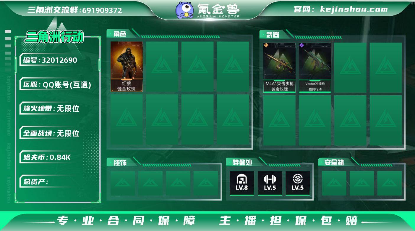 【PTSJZ2944】94m总资产-844k哈伏币-49烽火等级-钻石-1战场等级-无军衔 【干员外观】:红狼-蚀金玫瑰 【近战皮肤】:近战-黑鹰 【传说外观】:M4A1突击步枪-蚀金玫瑰,AKM突击步枪-锦绣,K437突击步枪-锦绣,SMG-45冲锋枪-锦绣,M14射手步枪-蛮荒,M14射手步枪-缄花,SR-25射手步枪-缄花,AWM狙击步枪-万金泪冠,.357左轮-缄花 【史诗外观】:Vector冲锋枪-猎鳄行动,MP7冲锋枪-六套之力,M249轻机枪-丛影谍踪,QJB201轻机枪-炽焰,VSS射手步枪-丛影谍踪 【稀有外观】:SG552突击步枪-马年新春,SG552突击步枪-贴花艺术,SCAR-H战斗步枪-荣耀列队,CAR-15突击步枪-来财,SMG-45冲锋枪-行动开启,SR-3M紧凑突击步枪-马年新春,SR-25射手步枪-开拓 【普通外观】:M4A1突击步枪-高雅黑,M4A1突击步枪-海色,QBZ95-1突击步枪-高雅黑,QBZ95-1突击步枪-海色,QBZ95-1突击步枪-2026,K416突击步枪-重击,SG552突击步枪-浅蓝涂装,SG552突击步枪-海浪,SCAR-H战斗步枪-数码迷彩,PTR-32突击步枪-典雅,MP5冲锋枪-海色,MP5冲锋枪-典雅,QJB201轻机枪-典雅,SVD狙击步枪-重击,SV-98狙击步枪-典雅,沙漠之鹰-重击,93R-典雅 【挂饰】:挂饰-蚀金玫瑰,挂饰-聚宝盆,挂饰-锦绣,挂饰-缄花,挂饰-紧急撤离*5,挂饰-麻将*11