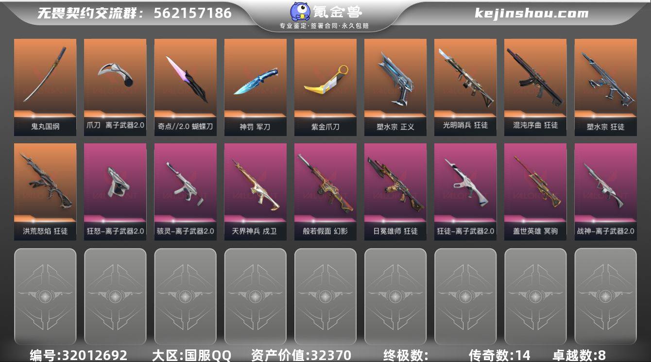 【自带包赔 可赔三倍】:库存价值32370 离子2.0套装 多热门主战 刀皮库存号 性价比超值 【近战】: 紫金爪刀, 离子武器//2.0 爪刀, 鬼丸国纲, 奇点//2.0 蝴蝶刀, 神罚 军刀 【狂徒】: 混沌序曲 狂徒, 洪荒怒焰 狂徒, 离子武器//2.0 狂徒, 塑水宗 狂徒, 光明哨兵 狂徒, 日冕雄师 狂徒 【幻影】: 般若假面 幻影 【冥驹】: 盖世英雄 冥驹 【正义】: 塑水宗 正义 【戍卫】: 天界神兵 戍卫 【骇灵】: 离子武器//2.0 骇灵 【狂怒】: 离子武器//2.0 狂怒 【战神】: 离子武器//2.0 战神 【概要】: 总皮肤 74 终极 0 传奇 14 卓越 8 刀皮 英雄 28 LV 214 历史最高:黄金 当前段位:黄金三 已使用 975 R点 剩余 290 R点 不可二次 卡面、挂饰、其他皮肤请看截图 道具、段位等以实际验号为准。如账号因没有维护,赛季更新等不可抗因素发生变化,不属于账号质量问题"