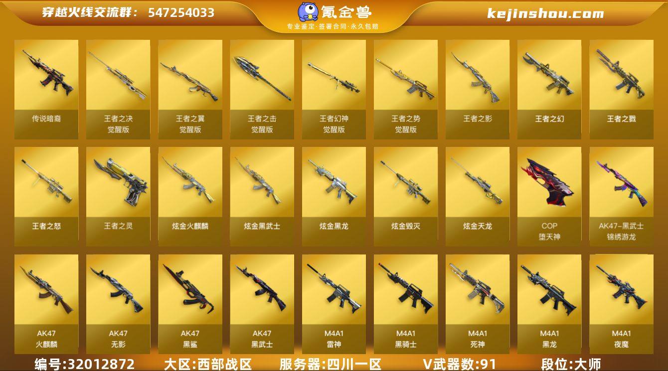 【CY62】四川一区-102V-16王者武器数-7炫金武器数 【传说武器】:传说暗裔 【热门武器】:传说暗裔,QBZ03-金色蔷薇,Scar Light-白虎,HK417-朱雀,M200-幻神,死亡之眼*3,Cat-刀锋,M4A1-黑骑士,汤姆逊-烈龙*7,RPK-盘龙*4,加特林-炼狱*2,COP-堕天神,沙鹰-修罗*7 【王者炫金武器】:王者之戮,王者之幻,王者之影,王者之怒,王者之灵*2,炫金火麒麟,炫金黑龙,炫金武士,炫金毁灭*2,炫金天龙*2,王者之魄高爆手雷,王者之魄闪光弹 【音效卡】:AN94-超新星-热带奇洋音效卡,AK47-火麒麟音效卡,M4A1-雷神音效卡,M4A1-黑骑士音效卡,Barrett-极光音效卡 【皮肤】:AWM-裁决-凤灵皮肤,雷神-星空,雷神-宇航兔皮肤,雷神-海滩派对 皮肤,雷神-化蛇 皮肤,火麒麟-平天大圣,AK47-火麒麟-百城23冠军皮肤,毁灭耀金皮肤,毁灭-秦师 皮肤,M4A1-千变-孔明皮肤,黑龙-暗月,M4A1-黑骑士-娜塔莉娅 皮肤,无影-暗月,烈火-动感闪耀 皮肤,战神-流金岁月皮肤,AK47-B-常胜将军-曹操,AK47-B-常胜将军-刘备,AK47-B-常胜将军-孙权*2,极光-能量核心,修罗-能量核心,龙啸-醒狮 皮肤 【角色】:零,葵,瞳,魅影,王者-瞳-闭月羞花,王者-葵-貂蝉,王者复仇,王者春,王者玲珑-小乔,蛇隐宗,奇洋探员,北极狐-X,电竞少女,芳心审判者,飞虎队-X,风暴女,嘉年华灵狐,疾风,娟娟,零-水下丽影,灵狐-花神,灵狐者-黄金海岸,曼陀罗-X,曼陀罗-礼服,玫瑰花神,萌儿,娜塔莉娅,潜龙队-X,蛇姬,铁骑荣耀,雪莉杨-摸金校尉,影武者-X,游珑儿,智影 【人偶武器】:天龙-曼陀罗,火麒麟-灵狐,巴雷特-零-水下丽影,AWM-灵狐-15周年嘉年华,Cat-刀锋,迷你深渊冰龙*2,迷你裂空之翼*2,迷你牛牛*3,迷你生化手雷,深渊终结者手雷*2,闪光弹-貂蝉,高爆手雷-大乔,迷你艾比 【暴走生化】:死亡之眼*3 【挑战大师】:...