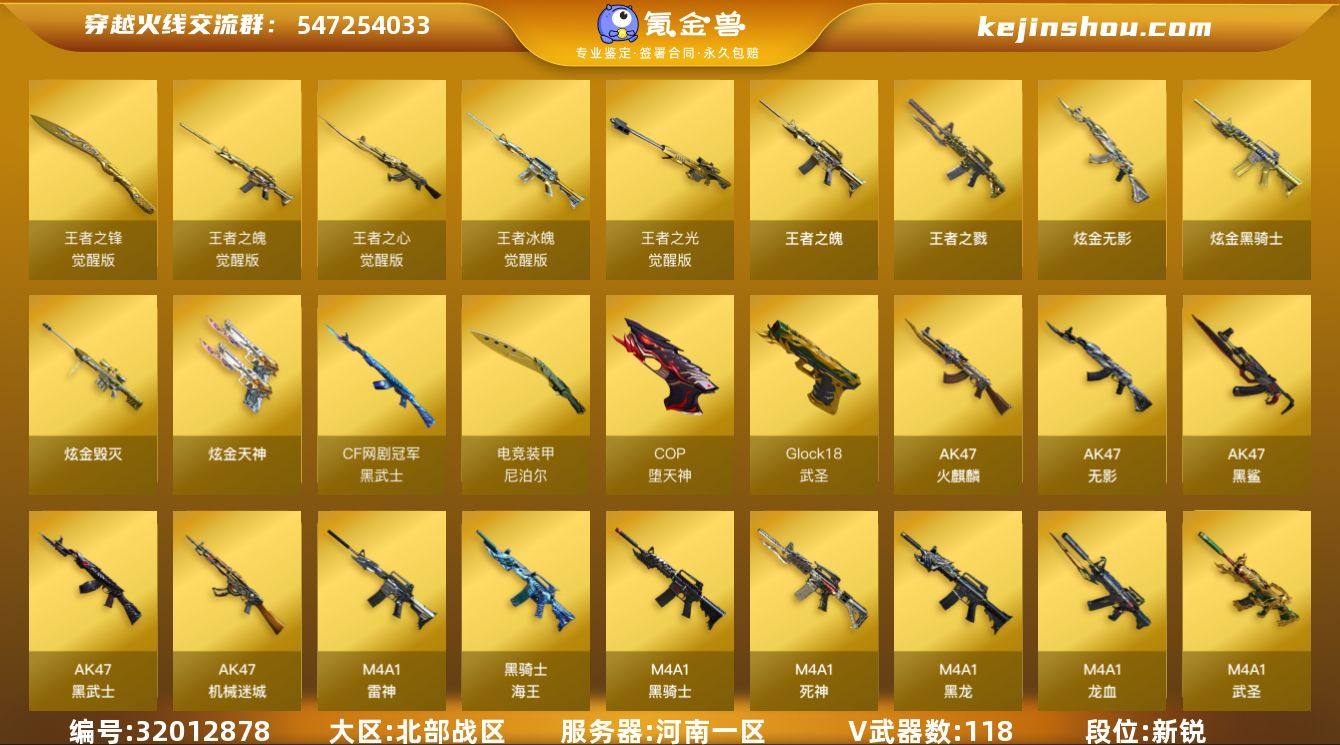 【ky5791】河南一区-127V-9王者武器数-4炫金武器数 【热门武器】:QBZ03-金色蔷薇,Scar Light-白虎,HK417-朱雀,M200-幻神,死亡之眼,荣耀世冠-雷神,荣耀世冠-柯尔特*2,M4A1-黑骑士*3,汤姆逊-烈龙*6,RPK-盘龙*6,斯泰尔-蝴蝶,降世魔童,USP-雷暴,COP-堕天神,沙鹰-修罗*5,荣耀世冠-龙啸 【王者炫金武器】:王者之戮*2,王者之魄,炫金骑士,炫金无影,炫金毁灭,炫金天神 【音效卡】:AK47-火麒麟音效卡,M4A1-雷神音效卡*2,M4A1-黑骑士音效卡,Barrett-毁灭音效卡 【皮肤】:裁决-流光秘银,雷神-暗月,雷神-荣耀之魄,雷神-星空,雷神-虎将,雷神-烈虎皮肤,火麒麟-荣耀世冠AG,毁灭-荣耀之怒,毁灭耀金皮肤,毁灭-星空,M4A1-千变-孔明皮肤,黑龙-能量核心,无影-能量核心,天启-暗月,战神-粉色甜心皮肤,战神-紫绶金章皮肤,战神-流金岁月皮肤,天龙-能量核心,AWM-天龙-传奇70KG,AWM-天龙-传奇白鲨,极光-能量核心,修罗-能量核心*2 【角色】:葵,魅影,沙漠玫瑰,王者-瞳-闭月羞花,王者凌霄,王者-魅影,空,虎妞,卡塔琳娜,潜龙队-X,蜀雪,新灵狐者,雪莉杨-摸金校尉,影武者-X 【人偶武器】:斯泰尔-蝴蝶,迷你生化手雷,闪光弹-小乔,降世魔童 【暴走生化】:死亡之眼 【挑战大师】:暴君乱世-超越Max,神圣爆裂者III,AK47-冰龙粉碎者,激光毁灭者III-白马银枪,激光毁灭者III,KAC-圣炎切割者III*2,阐释者III 【英雄级武器】:M4A1-千变,AK47-火麒麟,M4A1-黑龙,M4A1-雷神,M4A1-黑骑士*3,AK47-无影,M4A1-死神,AK47-黑武士,AK12-天启,M4A1-武圣,AK47-机械迷城,AK47-黑鲨*2,M4A1-龙血*2,HK417-朱雀,Scar Light-白虎,QBZ03-金色蔷薇,王者之心-觉醒版,王者之魄-觉醒版,AK-47-猩红传说,AK47-B-战神,王者冰魄-觉醒版,黑骑士-海王,荣耀世冠-雷神,黑武士-CF网剧冠军,...