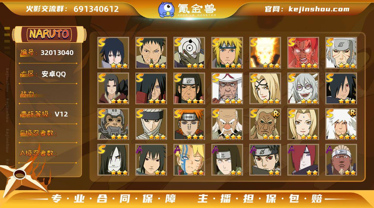 【HD175】安卓Q区-可二次【V11 25S忍 48A忍 22通灵 1190W战力】-白面具、破面、六道带土、漂泊佩恩、漂泊小南、漂泊带土 【S级忍者】:千手扉间「秽土转生」(3星),宇智波斑「秽土转生」(3星),宇智波斑「秽土转生·解」(3星),春野樱「忍界大战」(3星),宇智波带土「忍界大战」(3星),艾「忍界大战」(3星),宇智波鼬「须佐能乎」(3星),旗木卡卡西「须佐能乎」(3星),千手柱间「木叶创立」(3星),自来也「舞之豪杰」(3星),大蛇丸(4星),自来也「传说中的三忍」(3星),纲手(3星),纲手「百豪」(3星),猿飞日斩(4星),波风水门(3星),药师兜「仙人模式」(3星),神秘面具男「红夜之刃」(3星),迈特凯「死门」(3星),佩恩「天道」(3星),宇智波佐助「永恒万花筒」(3星),宇智波斑 「白面具」(3星宇智波斑「白面具」),波风水门「九喇嘛连结」(3星),漩涡鸣人·宇智波佐助(3星),宇智波带土「十尾人柱力」(3星) 【A级忍者】:艾「青年」(2星),长门「青年」(2星),波风水门「青年」(2星),达鲁伊「博人传」(2星),迪达拉(2星),迪达拉「秽土转生」(2星),大蛇丸「晓」(2星),奇拉比(2星),飞段(4星),飞段「死司凭血」(3星),干柿鬼鲛(5星),漩涡博人「桃式显现」(2星),漩涡鸣人「九尾查克拉」(3星),迈特凯(5星),旗木卡卡西「忍界大战」(2星),旗木卡卡西「万花筒写轮眼」(2星),旗木卡卡西「幻之真容」(2星),桃地再不斩「秽土转生」(2星),我爱罗「疾风传」(4星),蝎(4星),蝎「绯流琥」(2星),小南「漂泊浪客」(2星),角都「地怨虞」(2星),猿飞阿斯玛(5星),宇智波鼬「新春限定」(2星),宇智波佐助「须佐能乎」(2星),宇智波佐助「万花筒写轮眼」(2星),药师兜「半蛇斗篷」(2星),照美冥「夏日泳装」(2星),日向宁次「忍界大战」(2星),宇智波带土「漂泊浪客」(2星),长十郎「六代目水影」(2星),佩恩·六道「漂...