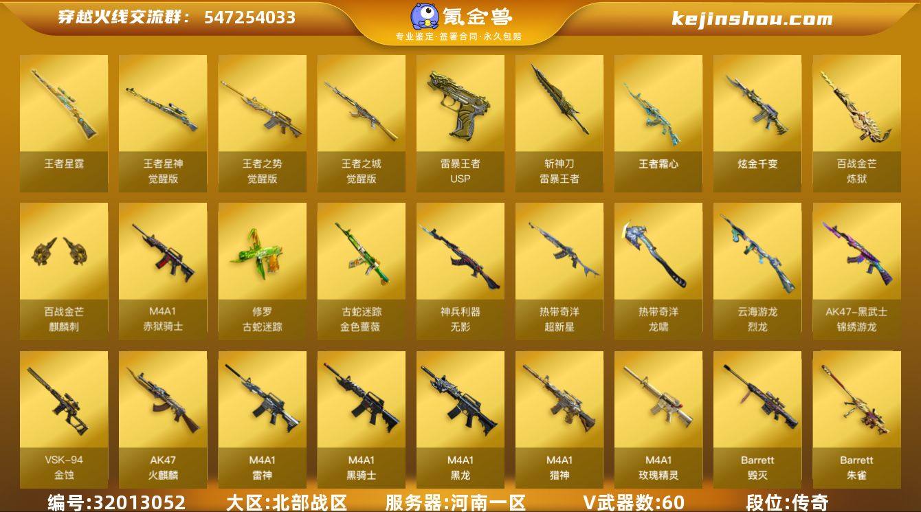 河南一区-64V-12王者武器数-1炫金武器数 【传说角色】:传说影煞 【热门武器】:QBZ03-金色蔷薇,金色蔷薇-古蛇迷踪,修罗-古蛇迷踪,M200-竞技荣光,M4A1-黑骑士,裁决-雪莉杨,炽芒蝶刃 【王者炫金武器】:王者霜心,王者星霆,USP-雷暴王者,斩神刀-雷暴王者,炫金千变,王者之魄高爆手雷 【音效卡】:天神-动感闪耀 音效卡,烈龙-云海游龙音效卡,修罗-古蛇迷踪音效卡,M4A1-黑骑士音效卡,Barrett-毁灭音效卡,白虎-盛典舞曲音效卡,炼狱-百战金芒-庆典舞曲音效卡,死神-雪域霜狐-怀旧音效卡,柯尔特-百战金芒-庆典舞曲音效卡 【皮肤】:QBZ03-AG-CFPLS19冠军,金色蔷薇-电竞之星 皮肤,裁决-流光秘银,AWM-裁决-百城联赛天津皮肤,裁决-胜者为王 皮肤,雷神-暗月,雷神-虎将,雷神-R.LGD-CFPLS18冠军,雷神-诺拉 皮肤,M4A1-再燃火线,雷神-神秘按键 皮肤,火麒麟-心动糖果,毁灭耀金皮肤,毁灭-黑大圣皮肤,毁灭-英雄计划 皮肤,黑骑士耀金皮肤,Barrett-金色蔷薇-蛇姬 皮肤,屠龙-惊鸿 皮肤,轻型军用手斧-再燃火线,龙啸-青青莓果 皮肤,麒麟刺-月皮肤 【角色】:电竞教官-云悠悠,妮妮,战地猎狐,王者-瞳-闭月羞花,王者樱-热浪之夏,王者-迷迭香,雪域霜狐,蛇隐宗,奇洋探员,乔伊教练,云海玲珑,葵-阿尔法武装,暗夜-X,北极狐-X,初恋灵狐,电竞少女,芳心审判者,飞虎队-X,风暴女,虎妞,嘉年华灵狐,疾风,猎狐者-追月,零-热舞青春,零-水下丽影,灵狐-花神,灵狐者-X,龙儿,麻雀,萌儿,娜塔莉娅,潘多拉-X,潘多拉-甜心教官,蛇姬,斯沃特-X,蜀雪,兔囡囡,维纳斯,新娜塔莎,雪莉杨,夜玫瑰-幻能朋克,影武者-X,游珑儿 【人偶武器】:裁决-雪莉杨,火麒麟-灵狐*2,迷你宝贝,迷你钢铁终结者,迷你救赎猎手,Scar Light-马枪,迷你地狱终结者,AWM-灵狐-15周年嘉年华*2,COP-旗袍,迷你...
