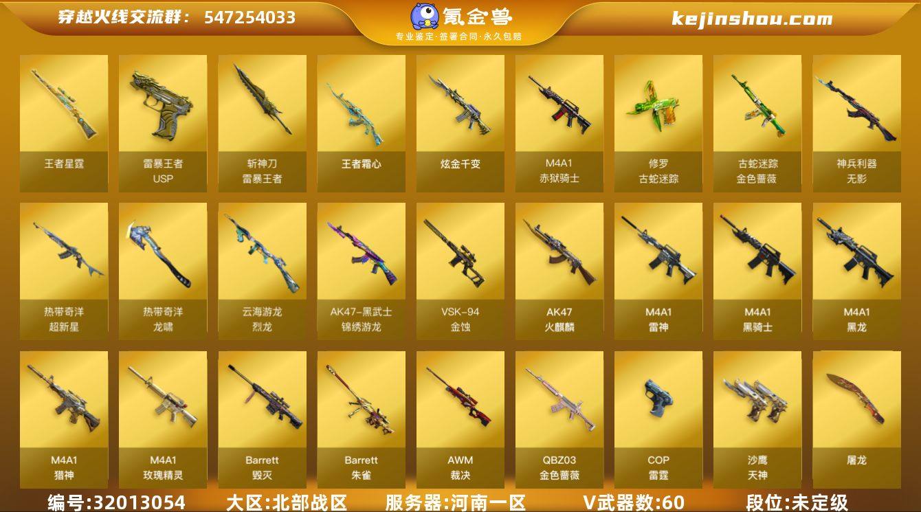 河南一区-64V-12王者武器数-1炫金武器数 【传说角色】:传说影煞 【热门武器】:QBZ03-金色蔷薇,金色蔷薇-古蛇迷踪,修罗-古蛇迷踪,M200-竞技荣光,M4A1-黑骑士,裁决-雪莉杨,炽芒蝶刃 【王者炫金武器】:王者霜心,王者星霆,USP-雷暴王者,斩神刀-雷暴王者,炫金千变,王者之魄高爆手雷 【音效卡】:天神-动感闪耀 音效卡,烈龙-云海游龙音效卡,修罗-古蛇迷踪音效卡,M4A1-黑骑士音效卡,Barrett-毁灭音效卡,白虎-盛典舞曲音效卡,炼狱-百战金芒-庆典舞曲音效卡,死神-雪域霜狐-怀旧音效卡,柯尔特-百战金芒-庆典舞曲音效卡 【皮肤】:QBZ03-AG-CFPLS19冠军,金色蔷薇-电竞之星 皮肤,裁决-流光秘银,AWM-裁决-百城联赛天津皮肤,裁决-胜者为王 皮肤,雷神-暗月,雷神-虎将,雷神-R.LGD-CFPLS18冠军,雷神-诺拉 皮肤,M4A1-再燃火线,雷神-神秘按键 皮肤,火麒麟-心动糖果,毁灭耀金皮肤,毁灭-黑大圣皮肤,毁灭-英雄计划 皮肤,黑骑士耀金皮肤,Barrett-金色蔷薇-蛇姬 皮肤,屠龙-惊鸿 皮肤,轻型军用手斧-再燃火线,龙啸-青青莓果 皮肤,麒麟刺-月皮肤 【角色】:电竞教官-云悠悠,妮妮,战地猎狐,王者-瞳-闭月羞花,王者樱-热浪之夏,王者-迷迭香,雪域霜狐,蛇隐宗,奇洋探员,乔伊教练,云海玲珑,葵-阿尔法武装,暗夜-X,北极狐-X,初恋灵狐,电竞少女,芳心审判者,飞虎队-X,风暴女,虎妞,嘉年华灵狐,疾风,猎狐者-追月,零-热舞青春,零-水下丽影,灵狐-花神,灵狐者-X,龙儿,麻雀,萌儿,娜塔莉娅,潘多拉-X,潘多拉-甜心教官,蛇姬,斯沃特-X,蜀雪,兔囡囡,维纳斯,新娜塔莎,雪莉杨,夜玫瑰-幻能朋克,影武者-X,游珑儿 【人偶武器】:裁决-雪莉杨,火麒麟-灵狐*2,迷你宝贝,迷你钢铁终结者,迷你救赎猎手,Scar Light-马枪,迷你地狱终结者,AWM-灵狐-15周年嘉年华*2,COP-旗袍,迷你...