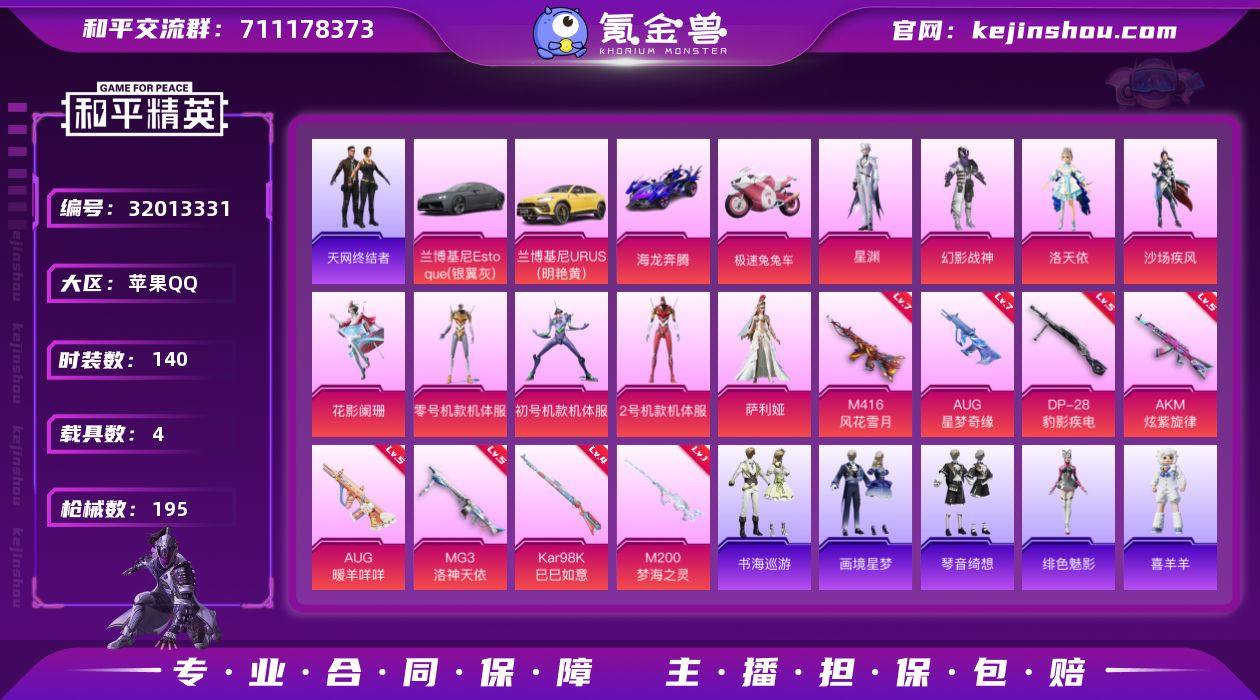 【Hhp222】苹果 手Q-9粉装-10特效枪-4载具-5粉色飞行器-67286热力值-11王牌印记-140套装-195枪皮 苹果Q区--【4载具 10特效枪 9粉装 140套装 195枪皮】-优质装备:AUG-星梦奇缘(七级)、套装-天网终结者、角色-零号机款机体服、角色-初号机款机体服、角色-2号机款机体服 【热门品类】:套装-小丑鱼,套装-天网终结者,套装-忍者信条,套装-龟仙人 【粉色套装】:粉装-幻影战神,角色-洛天依,粉装-沙场疾风,粉装-花影阑珊,角色-零号机款机体服,角色-初号机款机体服,角色-2号机款机体服,角色-萨利娅,角色-星渊 【粉色枪皮等级】:AKM-炫紫旋律(五级),M416-风花雪月(七级),AUG-星梦奇缘(七级),AUG-暖羊咩咩(五级),Kar98K-巳巳如意(四级),Mk14-福马献瑞(三级),M200-梦海之灵(一级),DP-28-豹影疾电(五级),MG3-洛神天依(五级),燃烧瓶-天降桃花(四级) 【粉色载具】:兰博基尼Estoque(银翼灰),兰博基尼URUS(明艳黄),海龙奔腾,极速兔兔车 【粉色枪皮】:AKM-炫紫旋律,M416-风花雪月,AUG-星梦奇缘,AUG-暖羊咩咩,Kar98K-巳巳如意,Mk14-福马献瑞,M200-梦海之灵,DP-28-豹影疾电,MG3-洛神天依,燃烧瓶-天降桃花 【粉色飞行器】:香车宝马飞行器,炫彩糖果飞行器,风花雪月飞行器,幻海精灵飞行器,曦光华影飞行器 【粉色降落伞】:神秘黑猫降落伞,洛神天依降落伞,海渊国主降落伞,圣堂之誓降落伞,精灵梦叶罗丽降落伞,星梦奇缘降落伞,精灵之光降落伞,临安公主降落伞,异瞳寒姬降落伞,炫彩糖果降落伞 【稀有套装】:套装-龟仙人,套装-巳巳如意,套装-雪国风尚,套装-炫彩糖果,套装-马上有钱,角色-临安公主,套装-燕燕于飞,套装-鱼渊荷华,套装-朱霞炽焰,套装-凌霄紫焰,套装-擎苍青焰,玩偶服-喜羊羊,角色-绯色魅影,套装-书海巡游,套装-画境星梦,套装-琴音绮想,套装-雨过天青,套装...