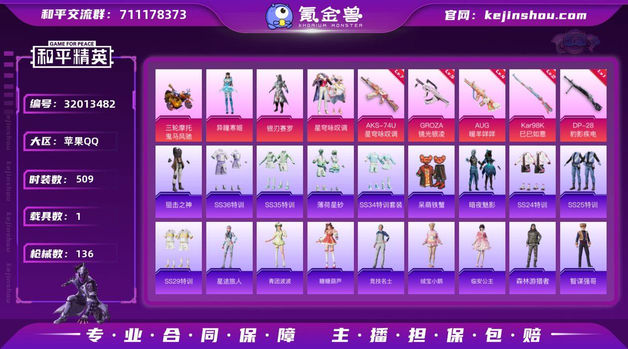苹果Q-1载具3粉装5特效枪7热门128套装136枪皮 42052热力值 历史荣耀皇冠Ⅰ 【1载具】 鬼马风驰 【3粉装】 异瞳寒姬 星穹咏叹调 银刃赛罗 【5特效枪】 AKS-74U-星穹咏叹调 (7级) Kar98K-巳巳如意 (2级) DP-28-豹影疾电 (1级) AUG-暖羊咩咩 (4级) GROZA-镜光银凌 (5级) 【7热门】 龟仙人 雪山精英 呆萌铁蟹 忍者信条 粉甜马卡龙 破蛋小黄鸡 黑色刀锋 【1背包】 神秘黑猫背包 营地ID:746723626