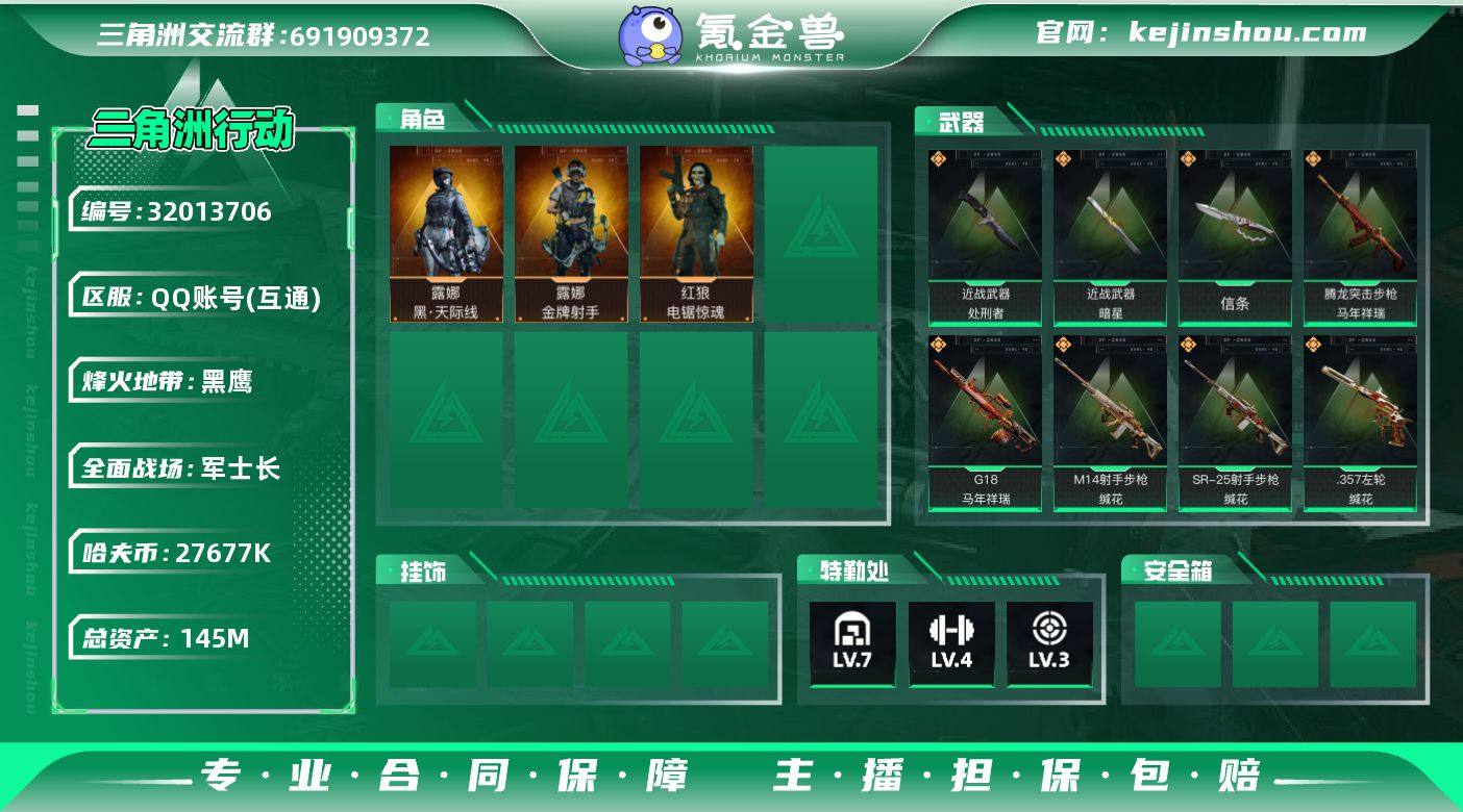 145m总资产-27677k哈伏币-60烽火等级-黑鹰-36战场等级-军士长 【干员外观】:露娜-黑·天际线,红狼-电锯惊魂,露娜-金牌射手 【近战皮肤】:近战-暗星,近战-信条,近战-处刑者1级,近战-黑鹰 【传说外观】:M4A1突击步枪-阿米娅,M16A4突击步枪-狩猎时刻,M7战斗步枪-神秘艺术,SG552突击步枪-运动员,AK-12突击步枪-特斯拉线圈,SCAR-H战斗步枪-启航,G3战斗步枪-狩猎时刻,G3战斗步枪-骑士,CAR-15突击步枪-阿米娅,腾龙突击步枪-马年祥瑞,KC17突击步枪-电锯惊魂,Vector冲锋枪-狩猎时刻,UZI冲锋枪-特斯拉线圈,SR-3M紧凑突击步枪-特斯拉线圈,勇士冲锋枪-能天使-午夜邮差,M250通用机枪-几何解构,M14射手步枪-蛮荒,M14射手步枪-缄花,SKS射手步枪-骑士,SR-25射手步枪-水墨云图,SR-25射手步枪-缄花,.357左轮-缄花,G18-马年祥瑞,复合弓-黑·天际线 【史诗外观】:QBZ95-1突击步枪-曙光,K416突击步枪-冬日风情,K416突击步枪-腊梅,M16A4突击步枪-竞赛选手,AUG突击步枪-蝮蛇,M7战斗步枪-百步穿杨,SG552突击步枪-深海恐惧,SG552突击步枪-哈夫克警备,G3战斗步枪-战场英杰,G3战斗步枪-流沙送葬,G3战斗步枪-哈夫克警备,AS Val突击步枪-百步穿杨,腾龙突击步枪-猎鳄行动,MP5冲锋枪-竞技风,Vector冲锋枪-猎鳄行动,Vector冲锋枪-百步穿杨,SMG-45冲锋枪-阿萨拉特攻,SR-3M紧凑突击步枪-英雄,SR-3M紧凑突击步枪-战术竞备,SR-3M紧凑突击步枪-开工大吉,勇士冲锋枪-深海恐惧,勇士冲锋枪-工业狂潮,勇士冲锋枪-丛影谍踪,MP7冲锋枪-六套之力,S12K霰弹枪-曙光,PKM通用机枪-蝮蛇,M249轻机枪-丛影谍踪,M250通用机枪-囚徒,QJB201轻机枪-炽焰,VSS射手步枪-丛影谍踪,SVD狙击步枪-暗夜猎手,M14射手步枪-工业狂潮,SV-98狙击步枪-林中猎手,SV-98狙击步枪-猎鳄行动,M700狙击步枪-竞技风,M700狙击步...