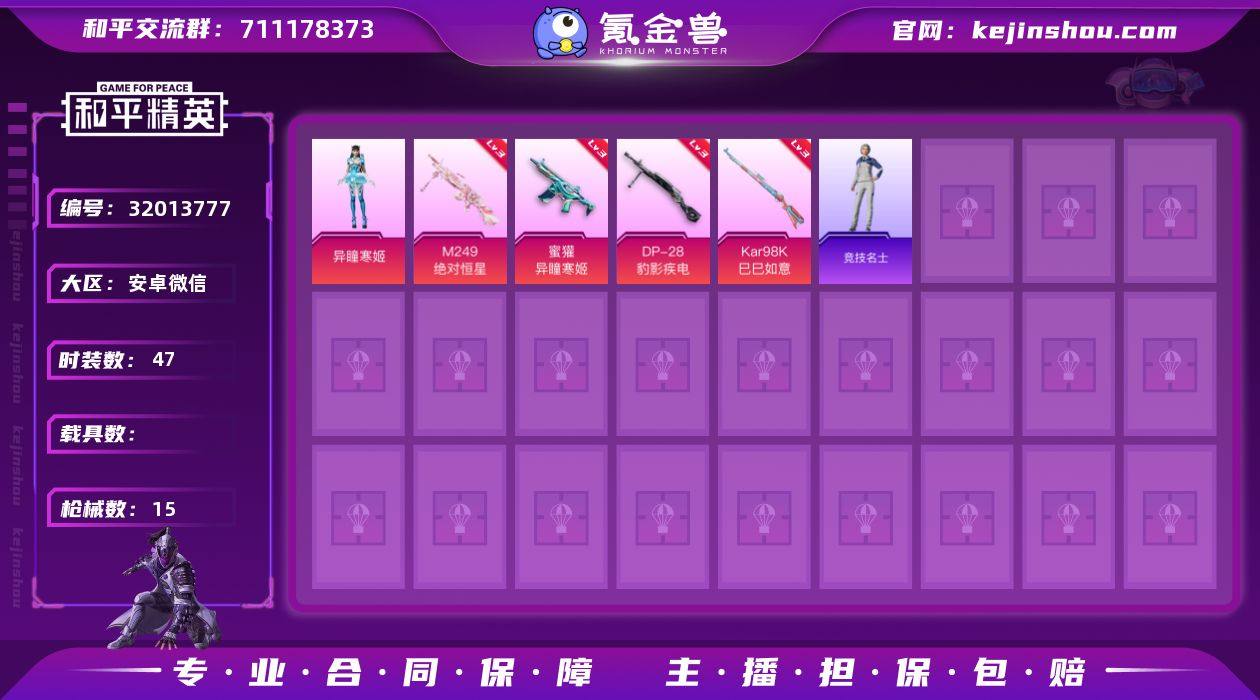 【特价出售】 安卓V-1粉装4特效枪9套装15枪皮 5002热力值 历史荣耀皇冠Ⅲ 【1粉装】 异瞳寒姬 【4特效枪】 Kar98K-巳巳如意 (3级) DP-28-豹影疾电 (3级) 蜜獾-异瞳寒姬 (3级) M249-绝对恒星 (3级)