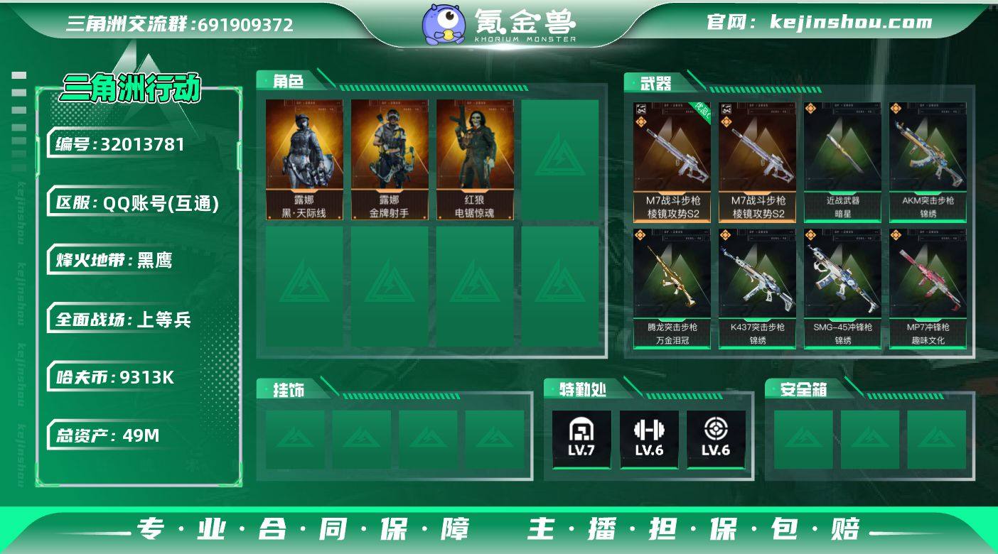 49m总资产-9313k哈伏币-60烽火等级-黑鹰-24战场等级-上等兵 【干员外观】:露娜-黑·天际线,红狼-电锯惊魂,露娜-金牌射手 【近战皮肤】:近战-暗星,近战-黑鹰 【典藏外观】:M7战斗步枪-棱镜攻势S2 【典藏外观成色】:M7战斗步枪-棱镜攻势S2(优品C) 【传说外观】:M4A1突击步枪-阿米娅,AKM突击步枪-锦绣,M7战斗步枪-零度协议,M7战斗步枪-机动小队,SG552突击步枪-运动员,SCAR-H战斗步枪-启航,G3战斗步枪-骑士,CAR-15突击步枪-阿米娅,AS Val突击步枪-蛇年祥瑞,腾龙突击步枪-捞点薯条,腾龙突击步枪-万金泪冠,K437突击步枪-锦绣,KC17突击步枪-电锯惊魂,SMG-45冲锋枪-锦绣,勇士冲锋枪-能天使-午夜邮差,MP7冲锋枪-趣味文化,M250通用机枪-骑士之心,M14射手步枪-电锯惊魂,M14射手步枪-蛮荒,SR-25射手步枪-水墨云图,R93狙击步枪-维什戴尔,AWM狙击步枪-捞点薯条,93R-捞点薯条,复合弓-黑·天际线 【史诗外观】:SR-25射手步枪-天命,QBZ95-1突击步枪-曙光,ASh-12战斗步枪-无极限,K416突击步枪-冬日风情,K416突击步枪-腊梅,AUG突击步枪-蝮蛇,M7战斗步枪-百步穿杨,SG552突击步枪-深海恐惧,SG552突击步枪-哈夫克警备,G3战斗步枪-流沙送葬,AS Val突击步枪-百步穿杨,K437突击步枪-守护者,MP5冲锋枪-深海恐惧,MP5冲锋枪-战术竞备,MP5冲锋枪-竞技风,Vector冲锋枪-百步穿杨,Vector冲锋枪-异域战争,勇士冲锋枪-深海恐惧,勇士冲锋枪-工业狂潮,MP7冲锋枪-守护者,MP7冲锋枪-六套之力,M249轻机枪-丛影谍踪,M250通用机枪-囚徒,QJB201轻机枪-炽焰,Mini-14射手步枪-守护者,VSS射手步枪-丛影谍踪,M14射手步枪-工业狂潮, M14射手步枪-航天庆典,SV-98狙击步枪-林中猎手,SV-98狙击步枪-囚徒,SV-98狙击步枪-猎鳄行动,M700狙击步枪-百步穿杨,M700狙击步枪-哈夫克警备,AWM狙击步枪-无极限,...
