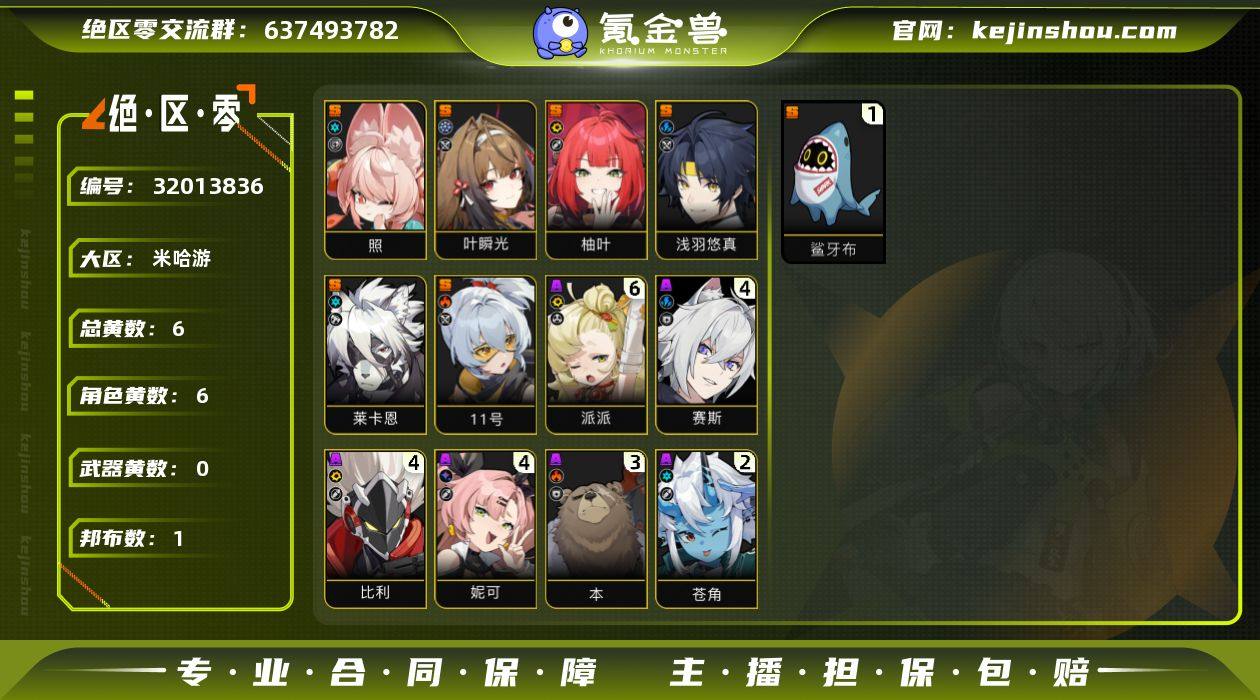 冒险等级:31 总黄数:6 五星角色数:6 菲林底片数量:0 菲林数量:89 加密母带数量:6 0命叶瞬光,0命照,0命柚叶,0命浅羽悠真,0命莱卡恩,0命「11号」 6命派派,4命赛斯,4命比利,4命妮可,3命本,2命苍角,2命安比,2命可琳,1命真斗,1命露西,1命安东,0命潘引壶 1精鲨牙布 漪光夜曲