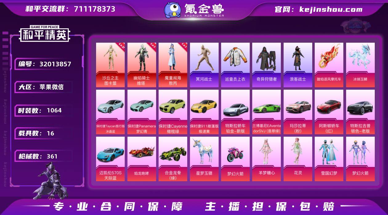 【特价出售】 苹果V-3红装6稀有18载具36粉装27特效枪43热门285套装358枪皮 160546热力值 22印记 历史无敌战神 【3红装】 魔童闹海-敖丙 (1级) 幽焰骑士-维塔 (1级) 沙丘之主-图卡盟 (2级) 【6稀有】 木乃伊 奇异狩猎者 巡查衣 AKM-缤纷海域 AKM-百万伏特 浪漫天命 【18载具】 保时捷Cayenne(橄榄绿) 保时捷Panamera(梦幻青) 保时捷Taycan旅行版(冰晶蓝) 保时捷911敞篷版(极速黄) 特斯拉R尊享铂 迈凯伦570S天际蓝 玛莎拉蒂粉色 兰博SVJ绿色 阿斯顿马丁S红色 冰绡玉鳞 合金龙骨绿色 焰龙咆哮 特斯拉X银色 星梦玉骢 双人摩托梦幻火箭 踏焰逐风摩托车 僚机-冰龙团团 萌兔起飞僚机 【36粉装】 红螳螂 圣堂之誓 梦幻火箭 蝶舞迷情 雪国幻梦 奇迹舞步美雪 奇迹舞步贝贝 奇迹舞步美琪 奇迹舞步雅雅 傲傲奶龙 宝贝奶油派 天使彩虹糖 甜心巧克力 千金淑猫 洛天依 花灵 火曜朱雀 水曜玄武 木曜青龙 金曜白虎 羊梦糖心 呆萌星弥 筑梦精灵 第五大道 新星烈龙 朗月武圣 鸾凤武仙 香水柠檬 童趣迷兔 冰霜白皇 甜梦小狐 紫电风暴 赤焰黑爵 冷魅冰骑 暗夜玫瑰 黄伞悠悠 【27特效枪】 M416-五爪金龙 (1级) M416-心之恋语 (7级) P90-魔童闹海敖丙 (1级) SCAR-L-魔童闹海哪吒 (3级) M416-墨龙九天 (3级) AKM-炫紫旋律 (1级) AKM-幽焰骑士 (3级) Kar98K-巳巳如意 (4级) M762-甜蜜誓约 (4级) MG-36-沧焰双生 (5级) DP-28-豹影疾电 (5级) AUG-星梦奇缘 (3级) AWM-花间之火 (5级) AMR-鸢尾晶梦 (6级) M24-镜域双华 (1级) AUG-星之彼岸 (7级) DP-28-圣堂之誓 (1级) SCAR-L-甜梦小狐 (3级) UZI-筑梦精灵 (5级) M417-第五大道 (3级) MG3-梦幻舞会 (5级) AKM-梦之光华 (7级) M16A4-垂柳戏鸭 (4级) MG3-洛神天依 (1级) Vector-红伞翩翩 (4级) SCAR-L-机甲封神 (1级) UMP45-恐龙拽拽 (5级) 【43热门】 小丑鱼 奇迹天团 龟仙人 星光纪元 萌神柯基...